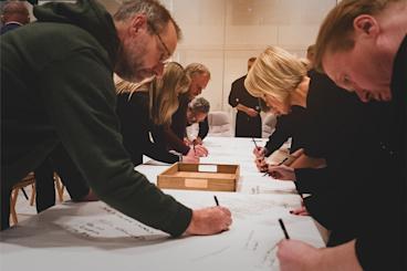 Ensimmäistä askelta ei tarvinnut kauaa odotella. Kattauksen päätyttyä pilotin osallistujia pyydettiin kirjoittamaan terveisensä päättäjille suoraan edessään olevaan pöytäliinaan, jonka jälkeen viesteillä koristeltu pöytäliina jatkoi matkaansa Eduskuntatalolle.