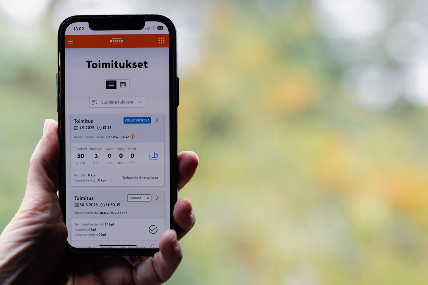 Vuonna 2024 lanseerattu Toimitukset-palvelu on ainutlaatuinen asiakkaan ja tukkurin välinen työkalu, jota kehitetään jatkuvasti asiakkailta saadun palautteen perusteella. Digitaalinen, helposti mukana kulkeva palvelu kuuluu automaattisesti kaikille Kespron tukkuasiakkaille.