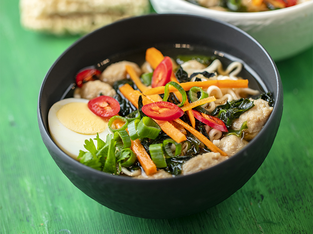 5. Laita keiton päälle suikaloitua merilevää, viipaloitua kevätsipulia, keitettyä kananmunaa, chilikastiketta, viipaloitua chiliä ja koristele tuoreella korianterilla.