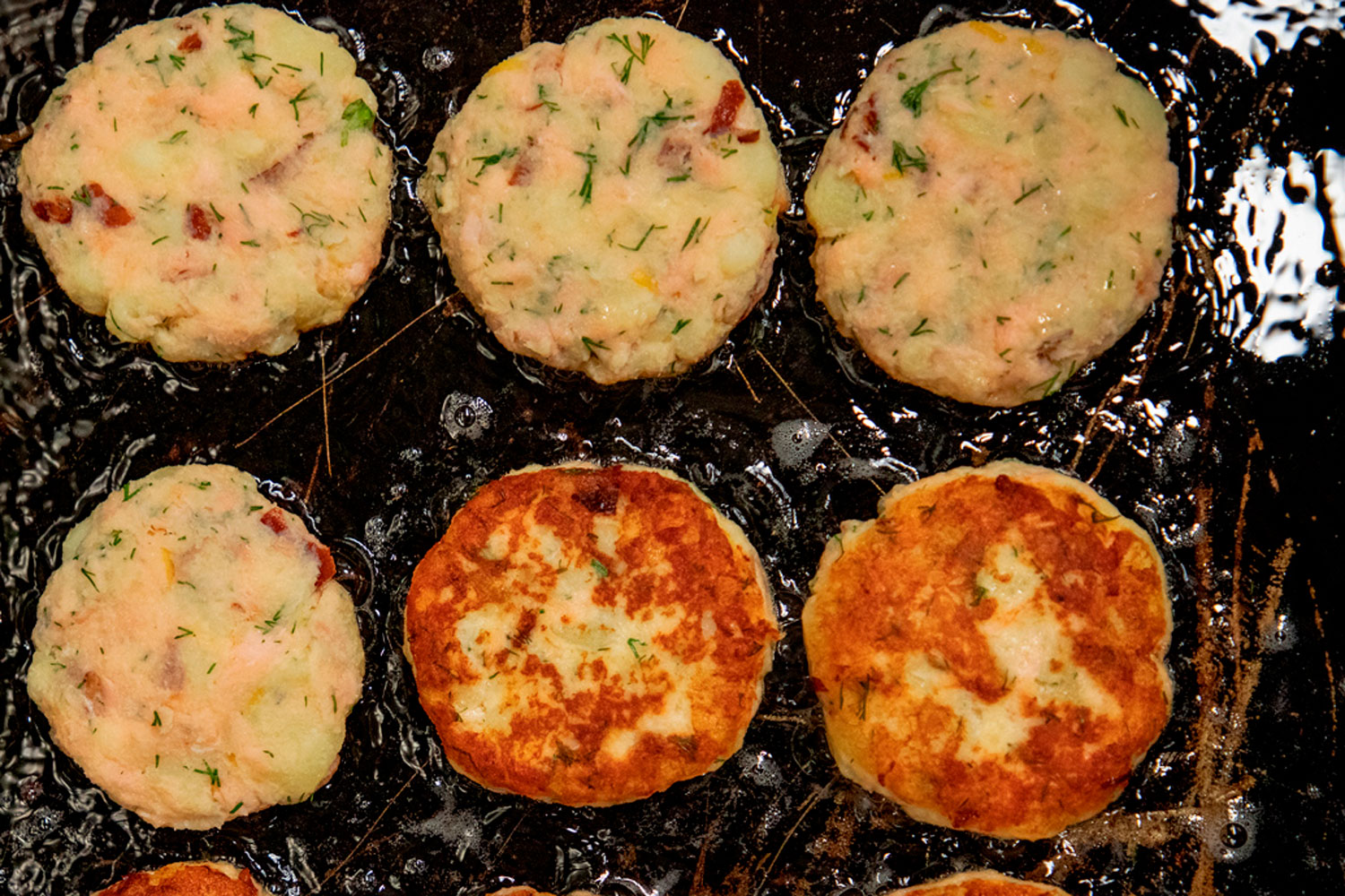 3. Muotoile pihveiksi ja pyörittele kikhernejauhoissa. Paista öljyssä rapeiksi.