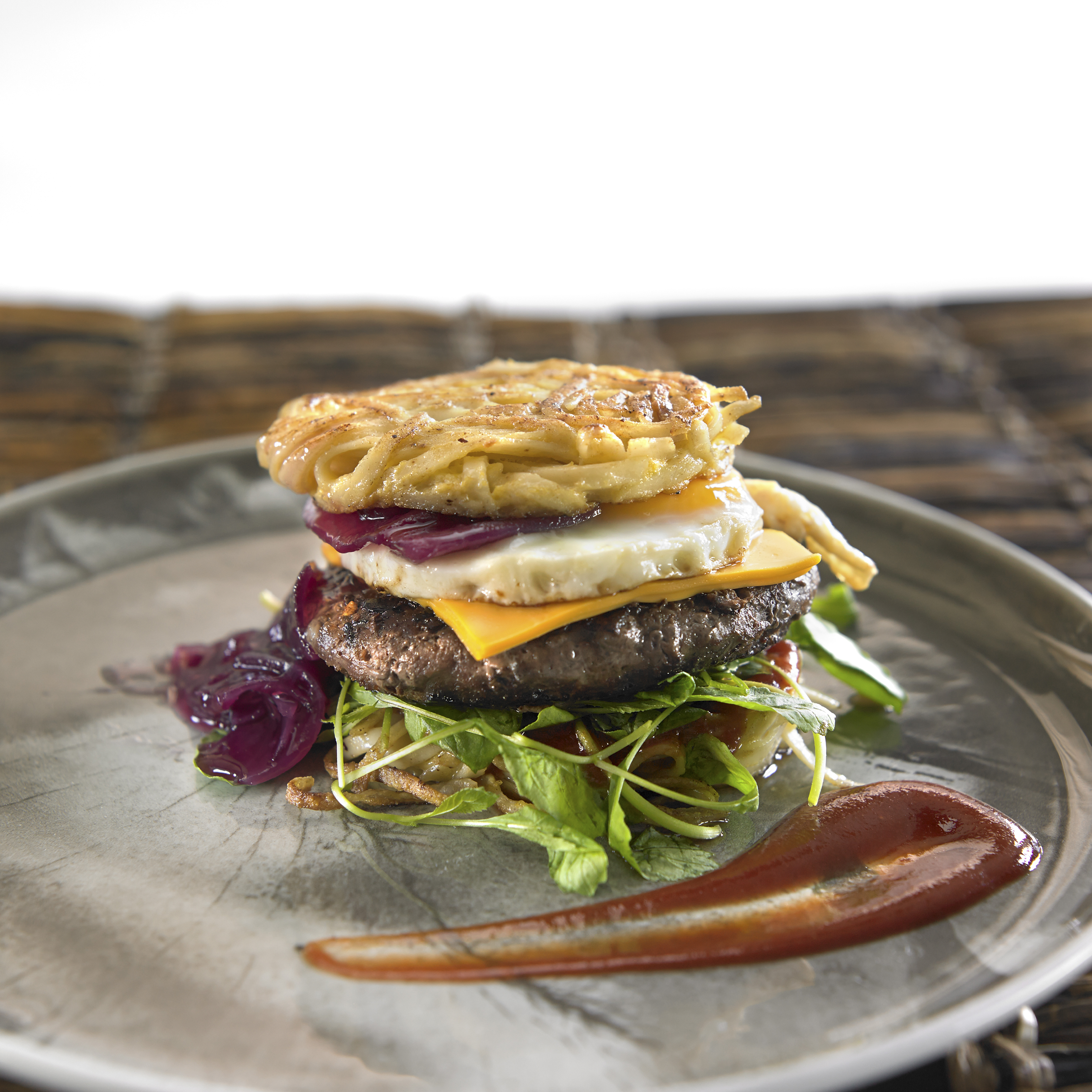 8. Laita esillelaittoastiaan nuudeli-papusalaattia ja päälle friteeratut juustot.