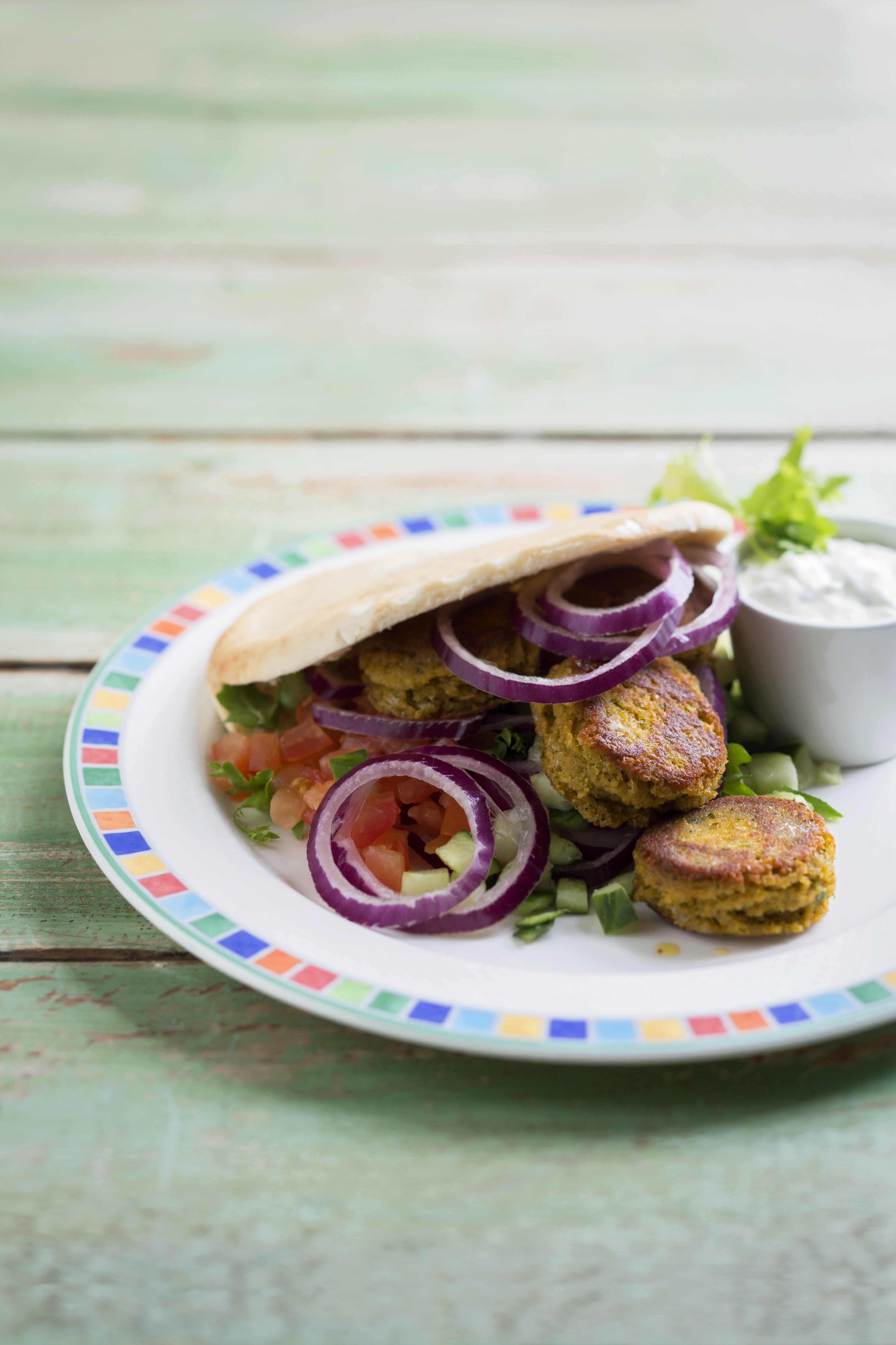 3. Muotoile massa tangoksi. Jaa osiin ja muotoile pyöryköiksi. Friteeraa falafelit, kokoa hodarit ja viimeistele tuoreella korianterilla.