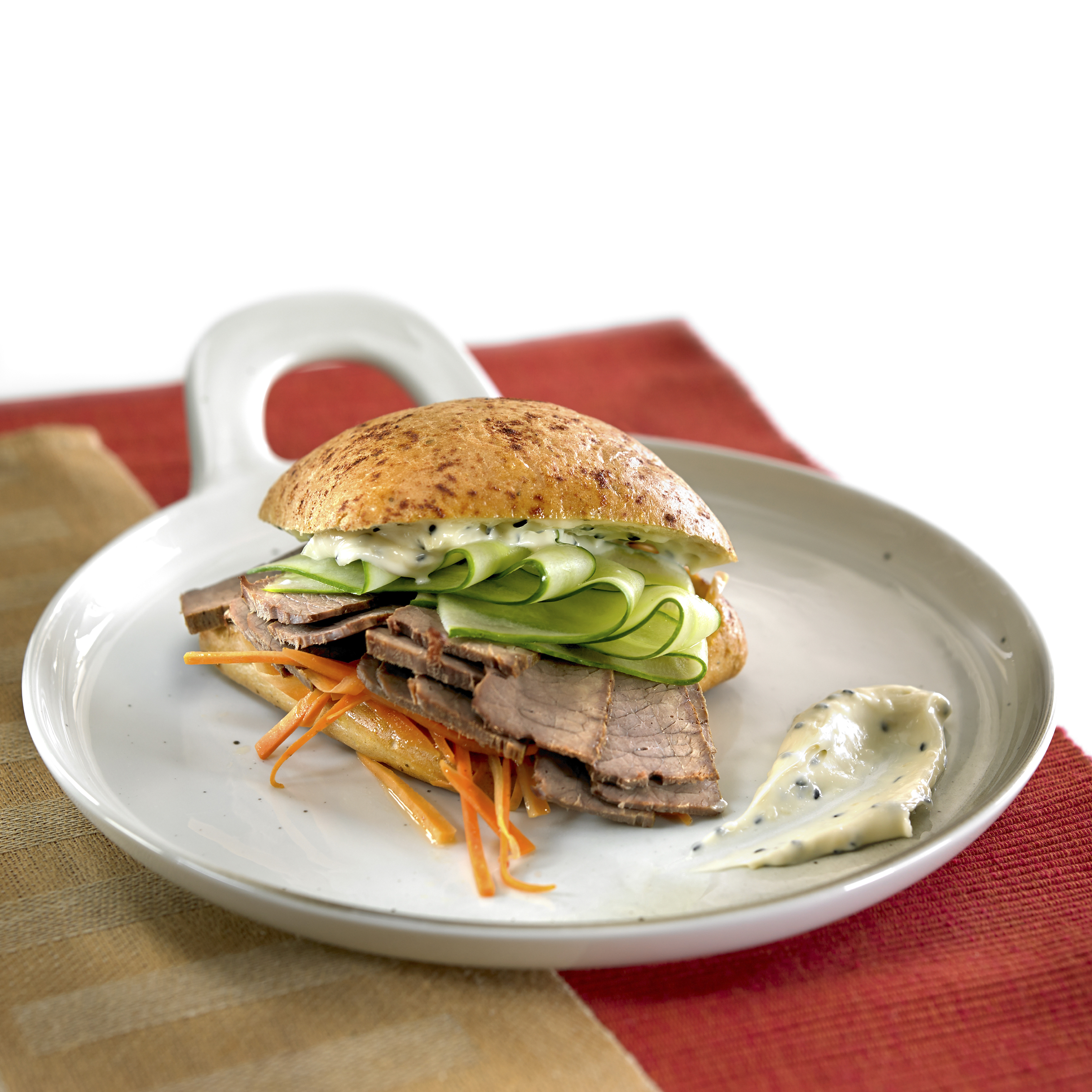 5. Täytä sämpylä hapankaalilla, naudanrintaviipaleilla ja emmentalviipaleilla.