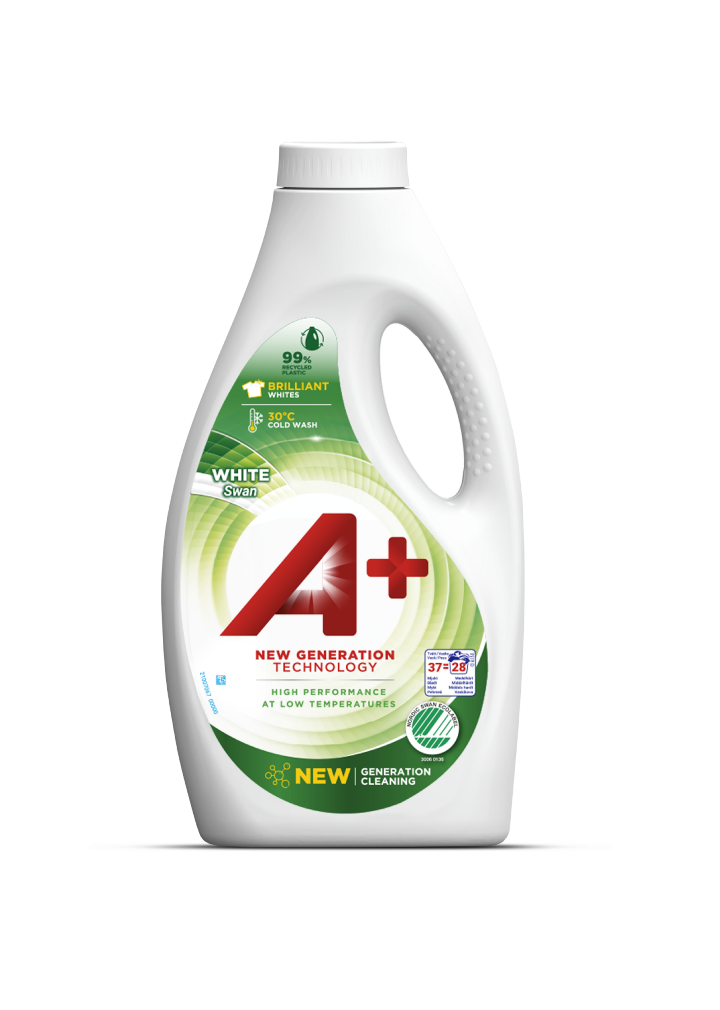 A+ White pyykinpesuneste on valkopyykille suunnattu ja tehokas alhaisissakin lämpötiloissa. Tuote on Joutsenmerkitty. Pakkaus on tehty 99% kierrätysmuovista, ja sen voi käytön jälkeen kierrättää.