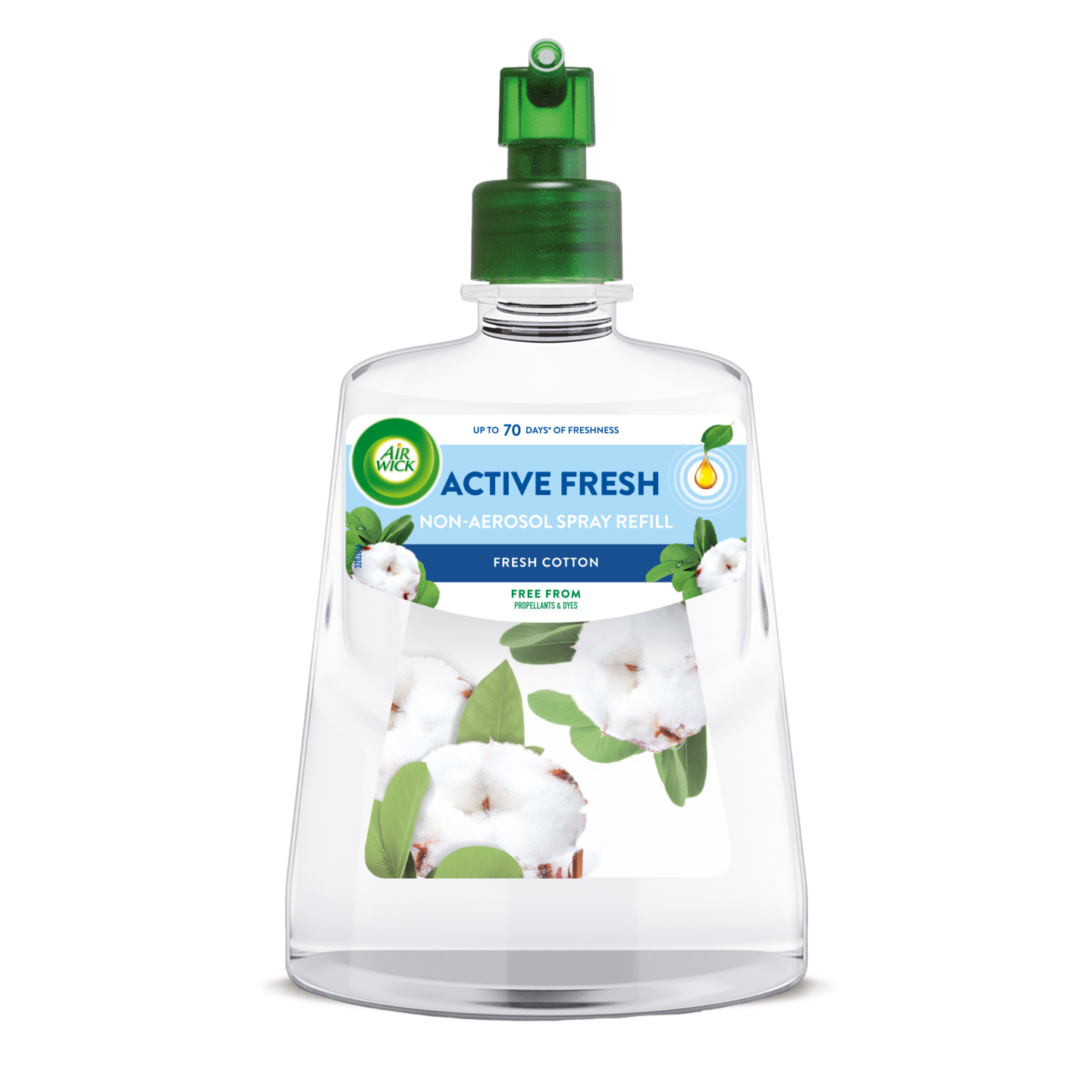 Air Wick Active Fresh Refill Fresh Cotton sisältää luonnollisia eteerisiä öljyjä, ja se on suunniteltu tuottamaan ympärivuorokautista raikkautta jopa 70 päivän ajaksi. Torju lemmikkien, kylpyhuoneen ja keittiön hajut uudella koostumuksellamme, joka ei sisällä ponneaineita eikä väriaineita.