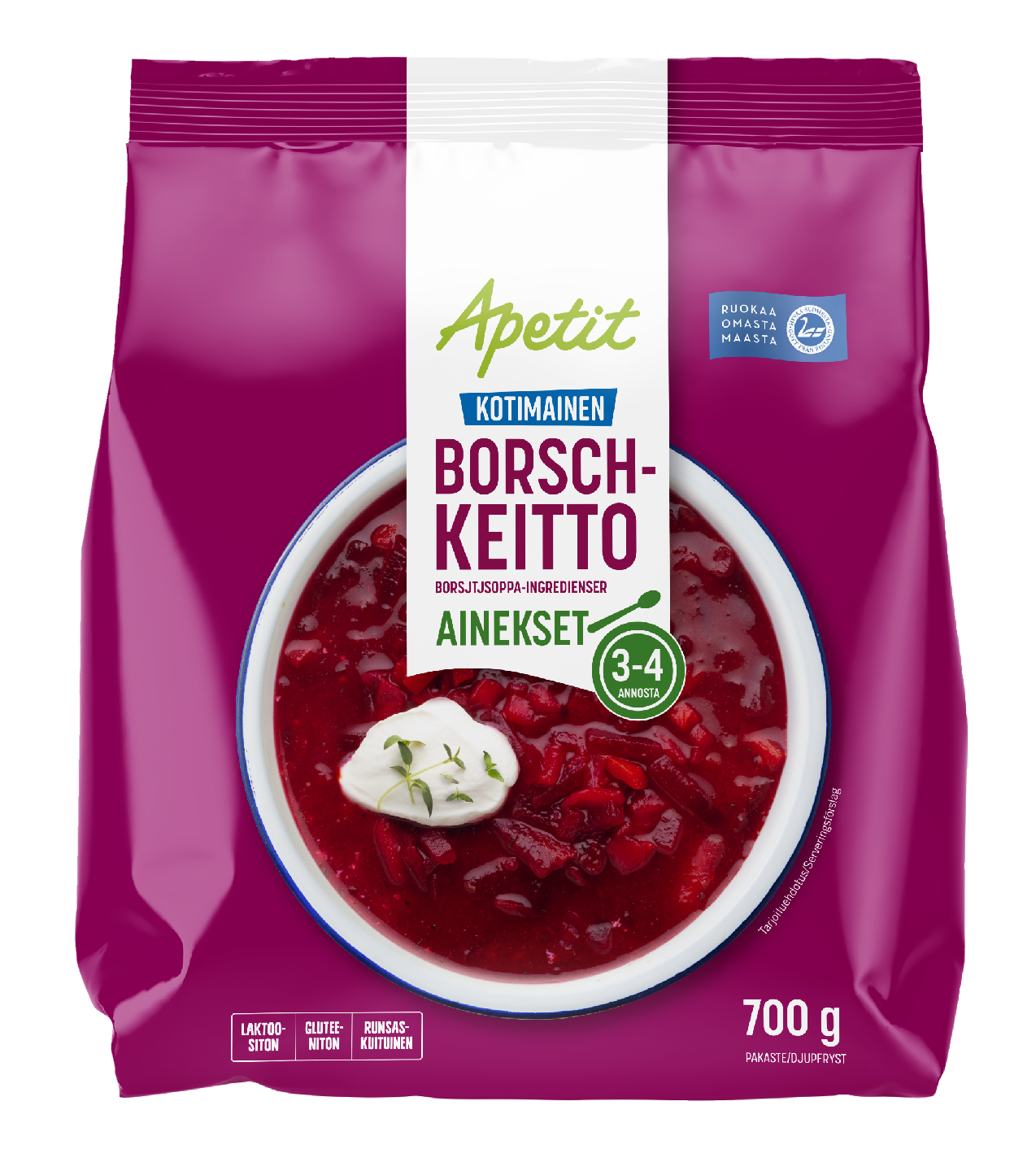 Apetit Borschkeittoaineksista valmistat helposti täyteläisen borschkeiton, joka tuo reilun määrän kasviksia aterialle. Keittoon voi lisätä haluamansa proteiinin. Lisää vain vesi. Keittoaika 30 min., valmista keittoa 1,2 l. Sopii myös vegaaniseen ruokavalioon.