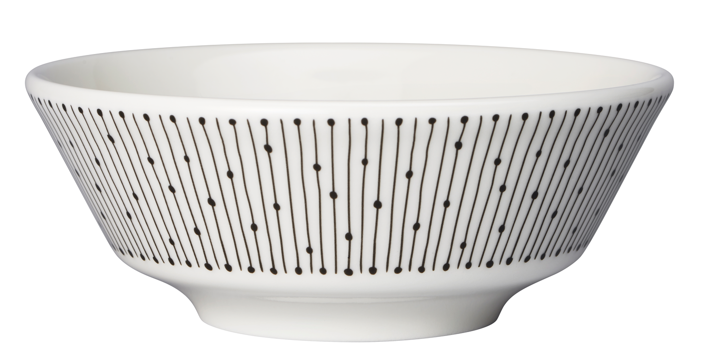 Halkaisijaltaan 13 cm kulhoa koristaa graafinen mustavalkoinen kuvio. Mainio Sarastus on uusi monikäyttöinen astiasarja, joka sopii pieneenkin ko