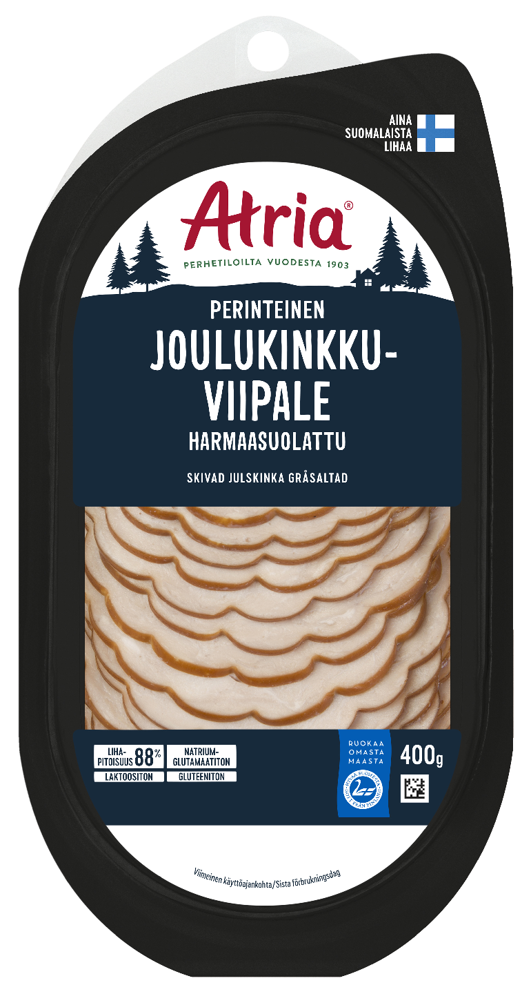 Kypsä ja viipaloitu Atria Joulukinkkuviipale on valmis tarjottavaksi. Perinteistä harmaasuolattua joulukinkkua, hieman paksumpina siivuina kuin leikkeleissä jolloin se toimii niin leivänpäällisenä kuin osana ateriaakin. Uudelleen suljettava rasia tekee tästä kätevän annostella ja nostaa tarjolle.