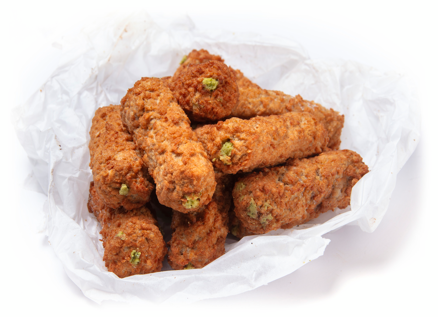 broilerinliha 62 %, kasvisyrttitäyte 17 % (peruna, vesi, pinaatti, herneproteiini, rypsiöljy, sakeuttamisaineet (muunnettu maissitärkkelys, E 461), mausteet (valkosipuli, sipuli, persilja, mustapippuri, kurkuma), jodioitu suola, hyytelöimisaine johanneksenleipäpuujauhe, aromit, sokeri), vesi, SOIJAPROTEIINI, korppujauho (VEHNÄ), rypsiöljy, jodioitu suola, perunakuitu, perunajauho, dekstroosi, mausteet (chili ancho, mustapippuri), aromit, hapettumisenestoaine E 300. Voimakassuolainen. Broilerinlihan alkuperä Suomi