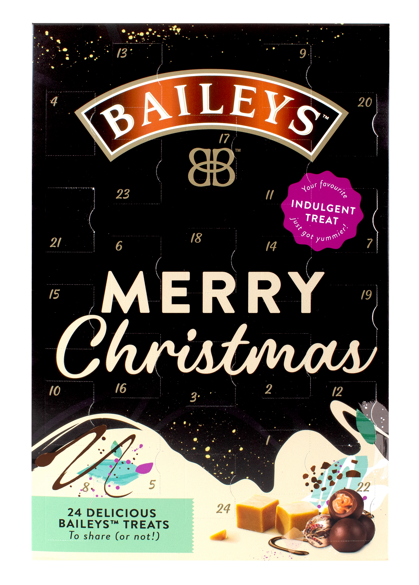 Baileys-liköörin makuisia suklaakonvehteja ja fudgea tyylikkäässä kalenterissa. Nauti matkasta kohti joulua.