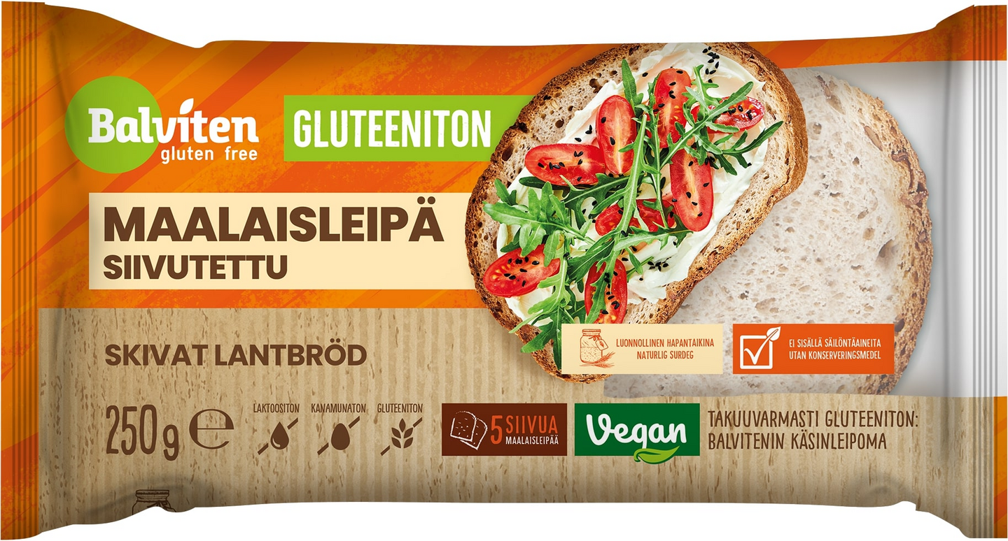 Balviten gluteeniton maalaisleipä on taidonnäyte käsinleivotusta leivästä. Tämä maittava valmiiksi viipaloitu leipä on täydellinen valinta esimerkiksi aamupalalle tai brunssille. Paahda tai paista kevyesti pannulla ja lisää lempitäytteesi. Paketin mukana tuleva tarra mahdollistaa pakkauksen sulkemisen ja näin ollen se pysyy tuoreena pidempään.