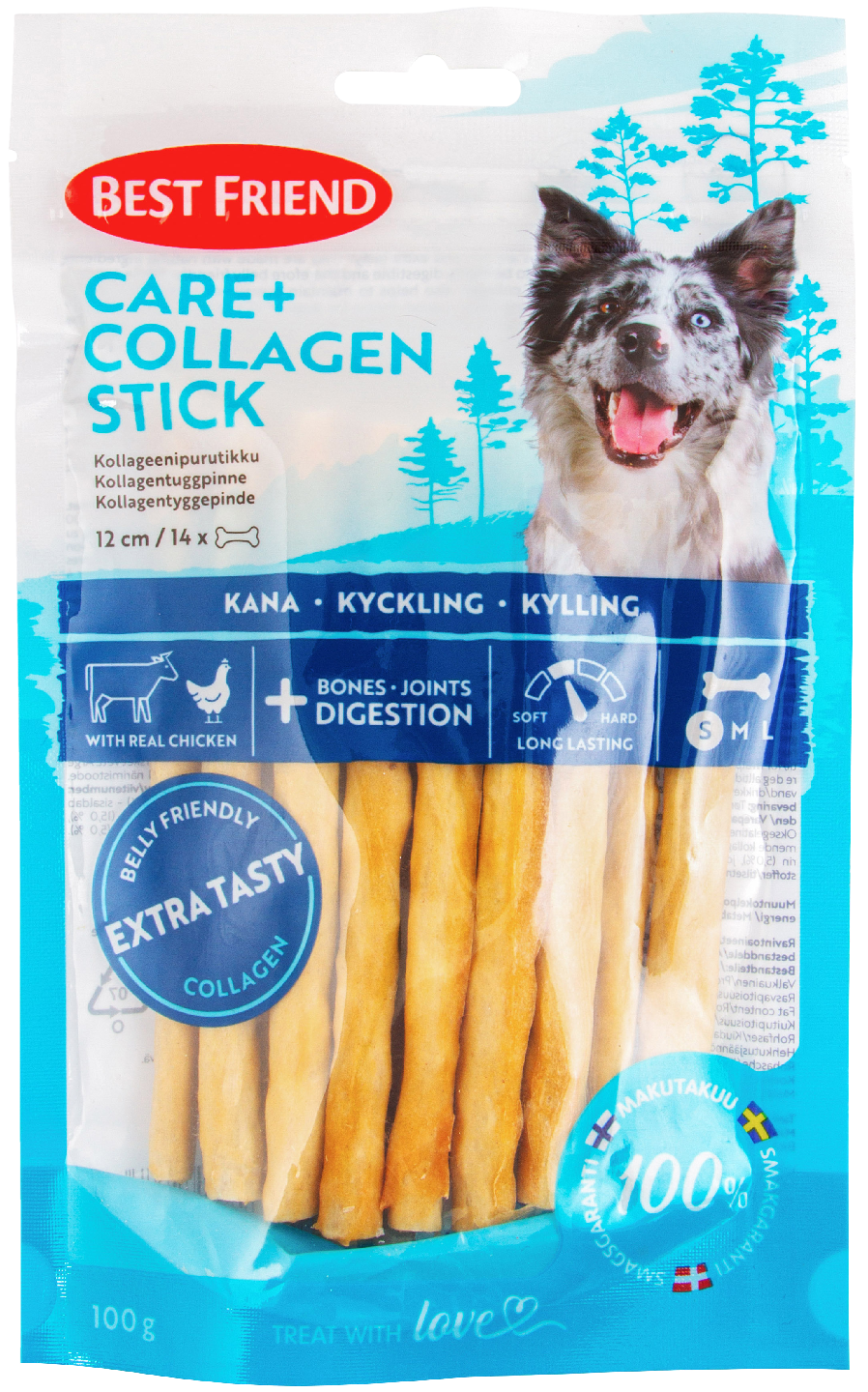 Best Friend Care+ Collagen Stick on hauska ja maukas purutikku koirille! Tämä rapea koiran purutikku on valmistettu luonnollisista ainesosista, kuten kollageenista. Kollageeni auttaa tukemaan luita ja niveliä, ihoa ja turkkia sekä koirien yleistä hyvinvointia. Kollageenipurutikkumme tarjoaa ainutlaatuisen pureskelukokemuksen, ja auttaa koiraa purkamaan luontaista pureskelun tarvetta. Herkullinen kana tekee purutikusta vastustamattoman maukkaan luun koirallesi! Care+ kollageenipurutikussa on vähän rasvaa ja kaloreita, joten se on loistava valinta kaikenkokoisille ja -ikäisille koirille. Tarjoa koirallesi maukas kollageenipurutikku hampaiden puhdistukseen, ajanvietteeksi ja rentoutumiseen -Treat with love.