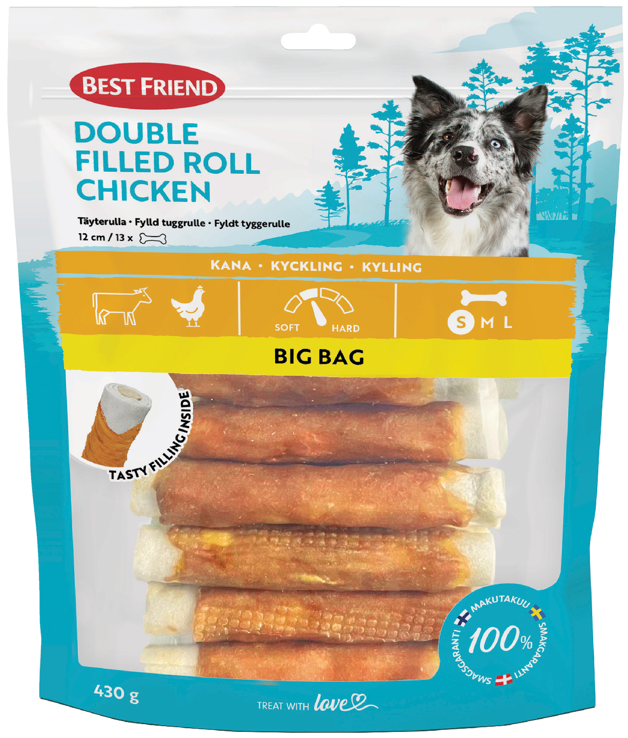 Best Friend Double kana täyterullat ovat herkullisia koirien suosikkeja! Laadukkaasta naudannahasta, maukkaasta herkkuluutäytteestä ja herkullisesta kananlihapäällisestä koostuva luu saa koirasi innostumaan pureskelusta. Kestävä naudannahka tarjoaa haastetta koirasi hampaille, kun taas maukas kananliha sekä herkkuluutäyte aktivoivat koiraa ja saavat jopa nirsoimmat yksilöt kerjäämään lisää! Double täyterullat kanalla ovat helposti sulavia, runsaasti proteiinia sisältäviä ja vähärasvaisia. Nämä pururullat ovat erinomainen valinta keskikokoisille koirille, joilla on kohtalainen puruvoima. Tuote sopii myös pienemmille koirille, joilla on voimakas puruvoima, tai suuremmille koirille päivittäiseksi herkuksi. Säännöllinen purutuotteiden käyttö auttaa ylläpitämään hampaiden ja ikenien terveyttä sekä ehkäisemään pahanhajuista hengitystä. Purutuotteet tarjoavat myös erinomaista viihdettä ja virkistävät koiraasi tehokkaasti tylsinä hetkinä, samalla kun ne herättävät koirasi luontaisen puruvietin. Jos koirasi saisi päättää, se järsisi vain Double täyterullia! Treat with love. Kätevä uudelleensuljettava pakkaus.