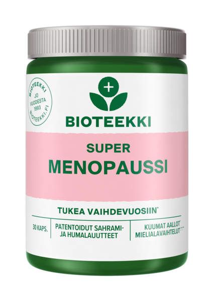 MaidotonBioteekki Super Menopaussi on laadukas ravintolisä antamaan tukea vaihdevuosiin ja helpottamaan vaihdevuosiin liittyviä tuntemuksia. Se sisältää kahta standardoitua, kliinisesti tutkittua tavaramerkki -raaka-ainetta: Saffr’Activ®-sahramiuutetta, joka antaa tukea vaihdevuosien mielialavaihteluihin sekä Luprenol® - humalauutetta, joka yhdessä valmisteen puna-apilan kanssa auttaa tasaamaan vaihdevuosiin liittyviä fyysisiä tuntemuksia, kuten kuumia aaltoja. B6-vitamiini osaltaan edistää hormonitoiminnan säätelyä ja edistää normaaleja psykologisia toimintoja. Valmiste on gluteeniton, laktoositon ja maidoton. Soveltuu myös vegaaneille.