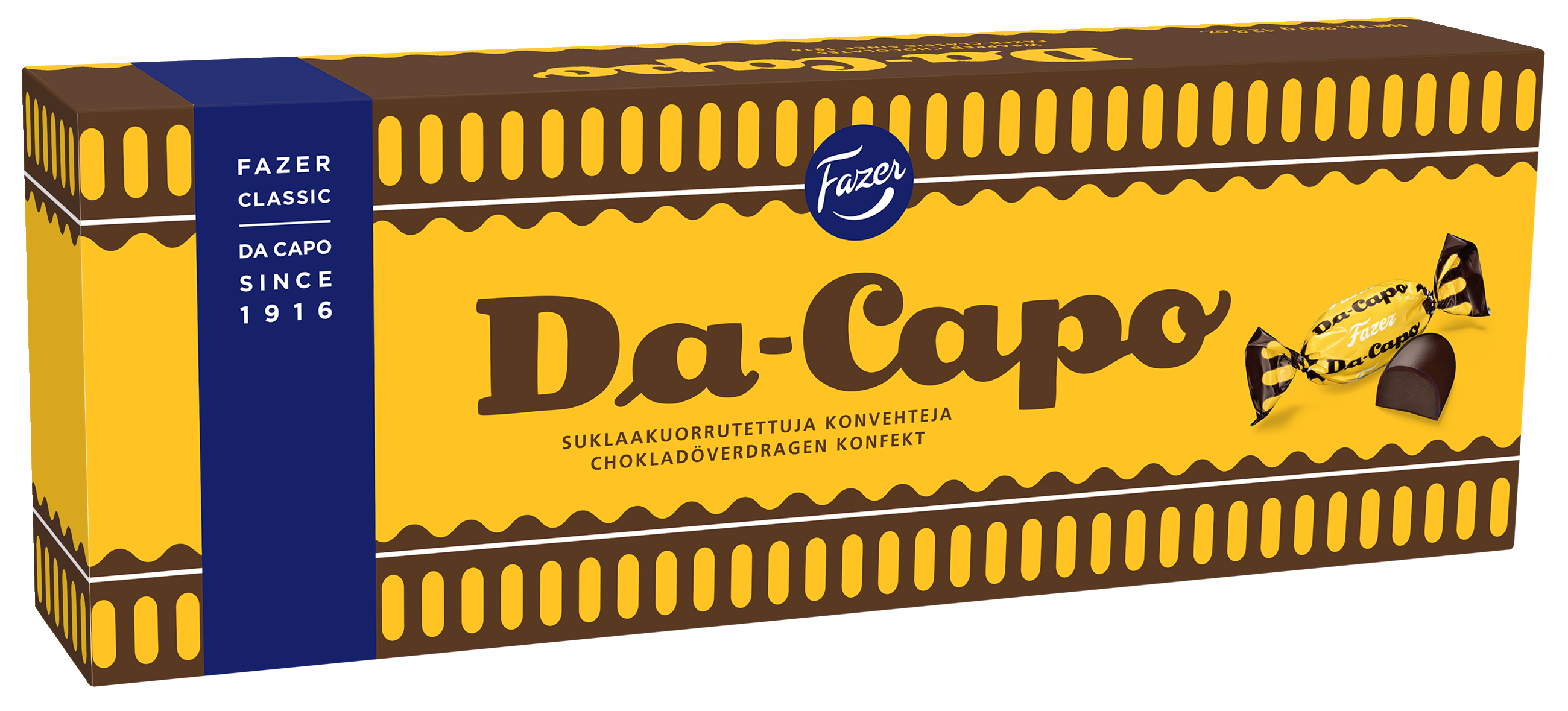 Da Capo on yli satavuotias klassikko, jota vuodet eivät paina. Tumman suklaan ja rommitryffelitäytteen täydellinen liitto maistuu täyteläisissä konvehdeissa. Noudatamme kaakaonhankinnassamme Fazerin kaakaovisiota. Lue lisää www.fazercocoavision.com. Da Capo on joulunajan odotettu herkku, joka sopii ihanaksi lahjaksi ja talven parhaisiin hetkiin.