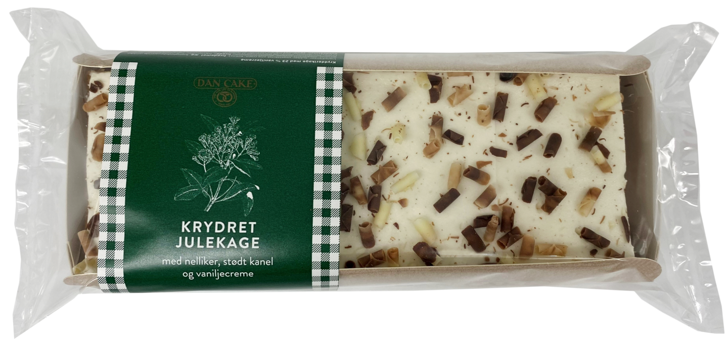 Herkullisen jouluinen premium maustekakku, jossa on vaniljakuorrute ja suklaahippuja.