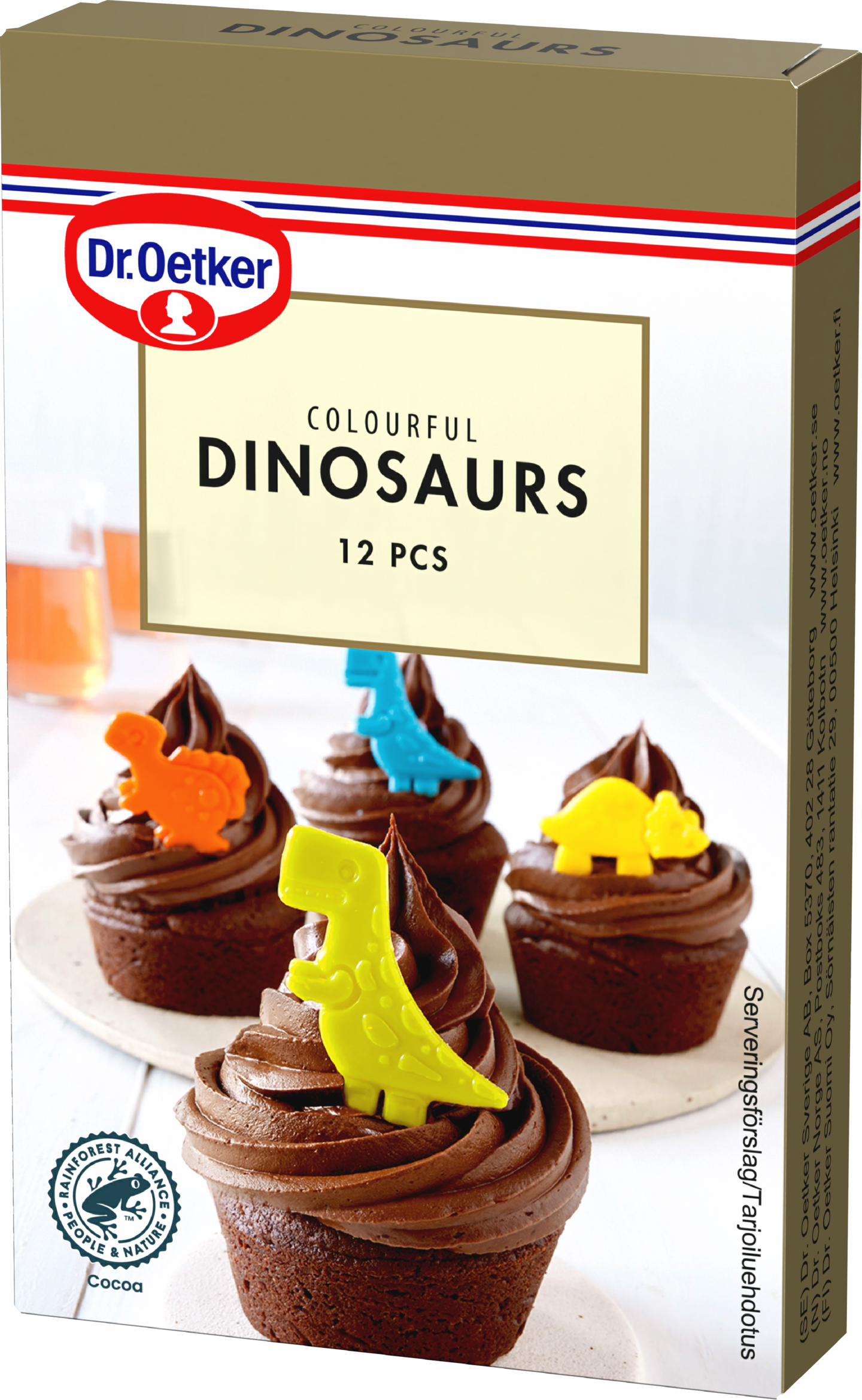 Herkulliset, vaniljanmakuiset dinosauruskuviot kakkujen ja muiden makeiden leivonnaisten koristeluun. Väreinä sininen, vihreä, keltainen ja oranssi. Pakkaus sisältää yhteensä 12 koristetta.