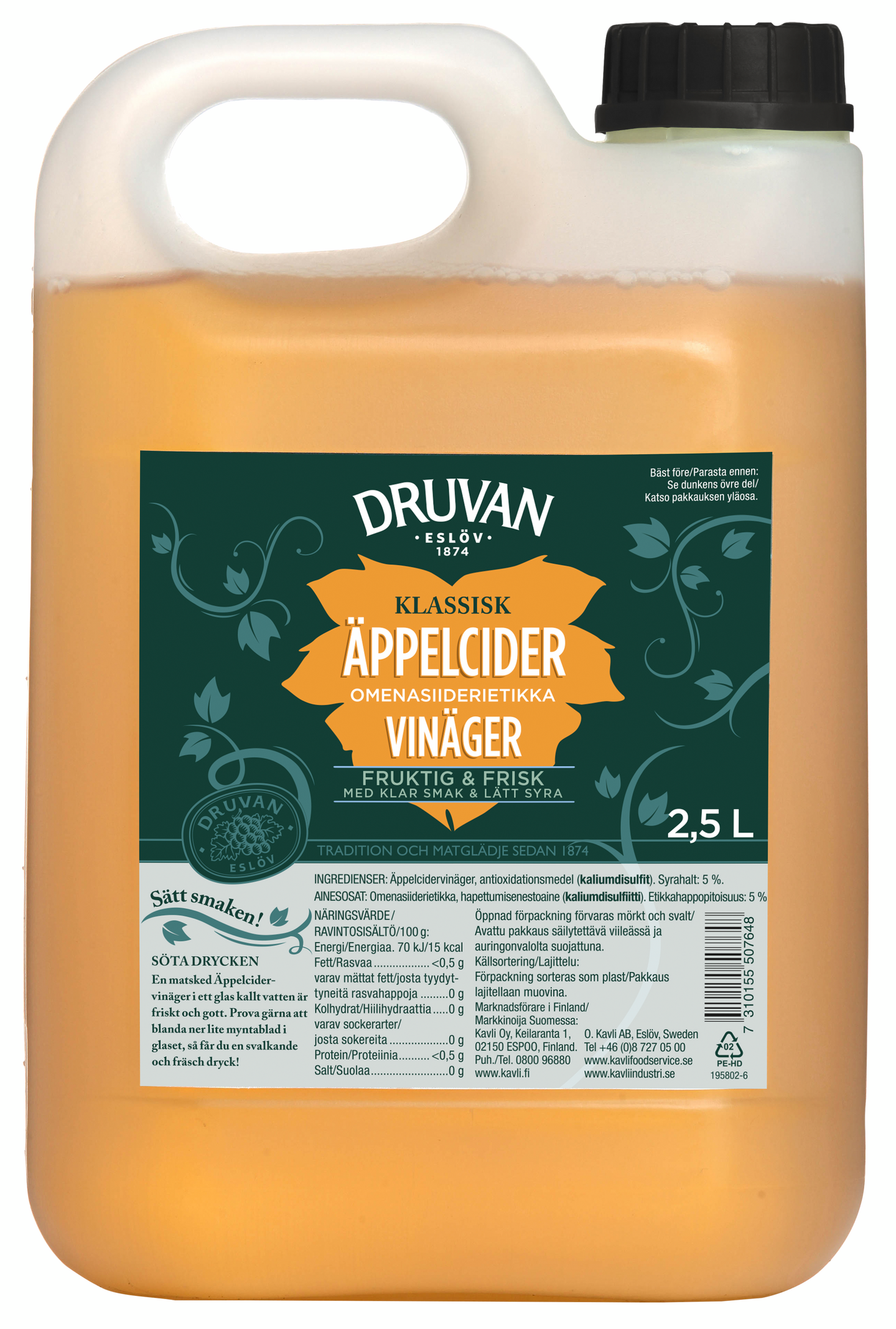 Omenasiiderietikka, hapettumisenestoaine (KALIUMDISULFIITTI). Etikkahappopitoisuus 5 %.