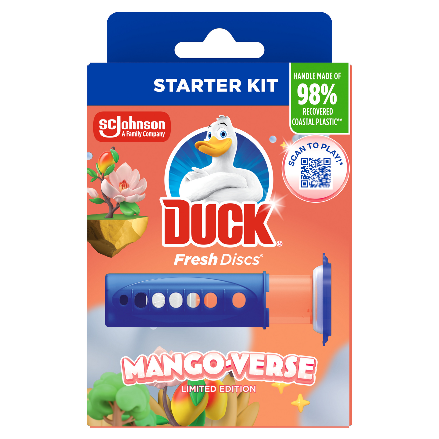 Duck Fresh Discs on ainutlaatuinen ja hygieeninen WC-raikastin ilman pöpöjä keräävää pidikettä. Yksi painallus pitää poissa tahrat, joihin bakteerit tarttuvat. Pakkaus annostelee juuri oikean määrän tuotetta muodostaen WC-pytyn sisäreunalle geelimäisen ruusukkeen, joka raikastaa ja puhdistaa WC-pyttyä jokaisella huuhtelulla. Fresh Discs ehkäisee myös kalkin muodostumista. Tarttuu myös märkään pintaan. Aloituspakkaus: sisältää asettimen ja 1 kpl 36 ml:n täytön. Tuoksu: Mango-Verse