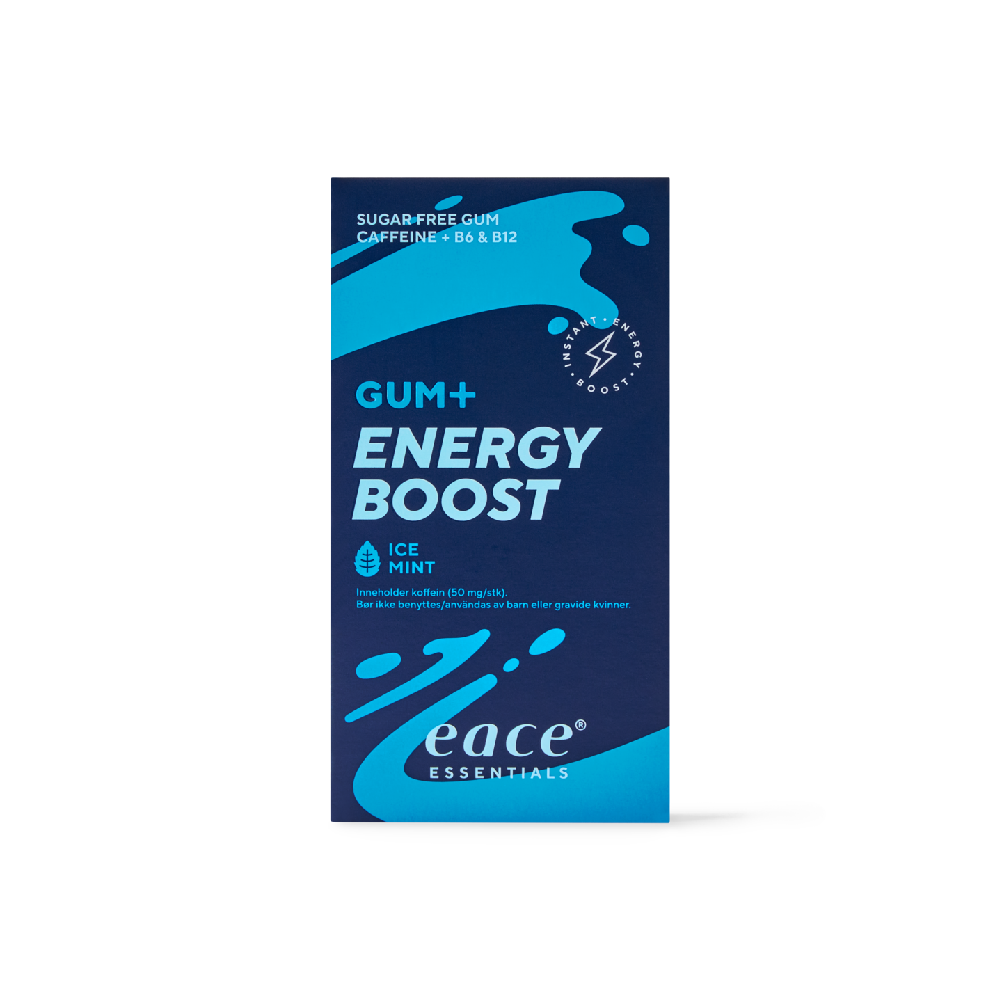 VegaaninenEace Gum + Energy Boost on raikas purukumi, joka sisältää kofeiinia ja B-vitamiineja, jotka antavat välittömän energiaboostin. Yksi purukumi sisältää 50 mg kofeiinia ja 15 % suositellusta päivittäisestä B6- ja B12-vitamiinin saannista. Se vastaa ½ energiajuomaa yhdessä purukumipalassa.