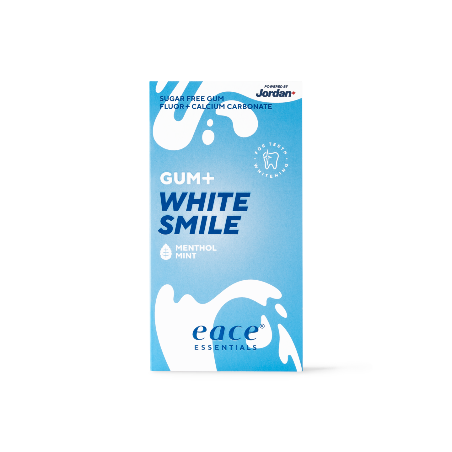 Eace Gum + White Smile on herkullinen purukumi, joka sisältää fluoria ja kalsiumkarbonaattia, jotka takaavat terveet hampaat ja auttavat poistamaan värjäytymiä hampaista. Yksi purukumi sisältää 0,175 mg fluoria ja 30 mg kalsiumkarbonaattia. Mentolin/mintun herkullinen maku varmistaa raikkaan hengityksen.