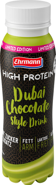 LaktoositonEhrmann High Protein -juoma Dubai suklaa style rapeilla " enkelihiuksilla" pistaasipähkinäsoseessa, joka on maustettu tahinilla. 20 g proteiinia, ei lisättyä sokeria, laktoositon ja silti tietysti herkullinen. Kuumin trendi jälkiruoka/suklaa-kategoriassa.