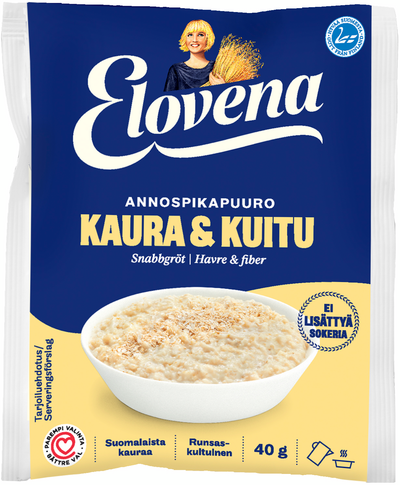 VegaaninenRunsaskuituinen Elovena Kaura & Kuitu on hyvä valinta kaurapuuron ystävälle. Annospussista oma lempipuuro valmistuu kätevästi suoraan lautaselle, tarvitaan vain kiehuvaa vettä. Puuro antaa energiaa päivän ponnistuksiin aamupalana, lounaseväänä, väli- ja iltapalana. Kauralese tuo puuroon rakennetta ja kuitua. Tuote on valmistettu Suomessa suomalaisesta kaurasta. Tuotteelle myönnetty Sydänmerkki kertoo, että se on terveellisempi valinta omassa tuoteryhmässään.