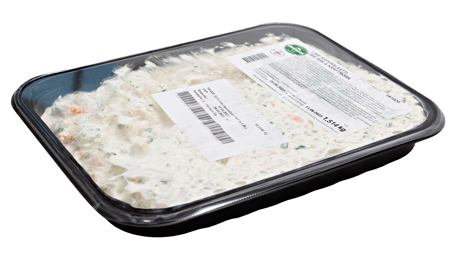 Majoneesi (rypsi- ja rapsiöljy, vesi, KELTUAINEN, sokeri, SINAPPI, suola, happamuudensäätöaineet (E260, E330), säilöntäaineet (E202, E211)), katkarapu [KATKARAPU (Pandalus borealis), vesi, suola, happamuudensäätöaineet (E331, E330), säilöntäaineet (E211, E202, E 262), stabilointiaine (E415)], purjo, punarapu [PUNARAPU (Procambarus clarkii), vesi, suola, happamuudensäätöaineet (E331, E330), säilöntäaineet (E211, E202, E 262), sakeuttamisaine (E415)], limemehu [(limettitäysmehu, limettiöljy, säilöntäaine (E224, KALIUMDISULFIITTI)], ruohosipuli, tilli. voi sisältää pieniä määriä nilviälisiä.