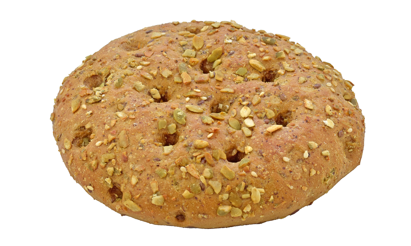 VEHNÄjauho, vesi, koristelu [kurpitsansiemen 8%, KAURAhiutale, SEESAMI, rapsi, riisijauho, suola, kurkuma, rapsiöljy, paprika], kurpitsakuutiot 5% [kurpitsa, auringonkukkaöljy], durumVEHNÄ, RUISjauho, pellavansiemen, kurpitsansiemen 3%, suola, hiiva, OHRAmallasuute, sokeri, auringonkukkaöljy, VEHNÄgluteeni, OHRAmallasjauho, acerolakirsikkatiiviste, paahdettu VEHNÄmallasjauho.