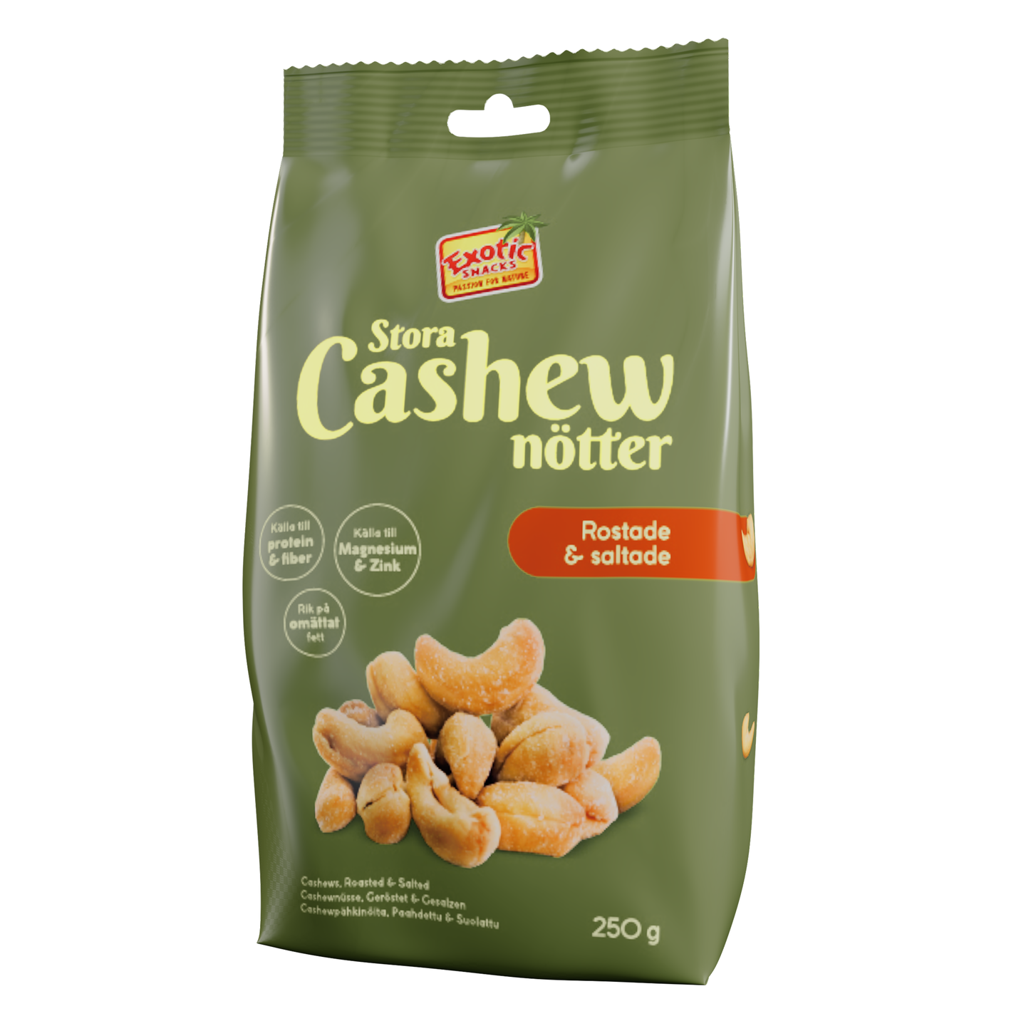 Kevyesti paahdetut ja suolatut cashewpähkinät täyteläisen herkullisella maulla. Nautiskele rapeana purtavana tai ripottele ruuan päälle. Nam! Cashewpähkinöissä on runsaasti tyydyttymättömiä rasvoja, rautaa ja sinkkiä.