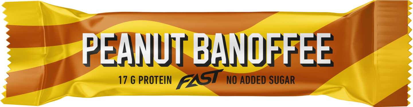 FAST Peanut Banoffee proteiinipatukassa kuohkean pehmeä maapähkinänmakuinen täyte yhdistyy runsaaseen banaanitoffeekerrokseen ja crispiseen maitosuklaakuorrutteeseen. Murskatut maapähkinät tekevät makuelämyksestä entistä herkullisemman! FAST Peanut Banoffee sisältää runsaasti proteiinia ilman grammaakaan lisättyä sokeria ja palmuöljyä. Patukan sisältämät proteiinit edistävät lihasmassan kasvua ja ylläpitämistä.