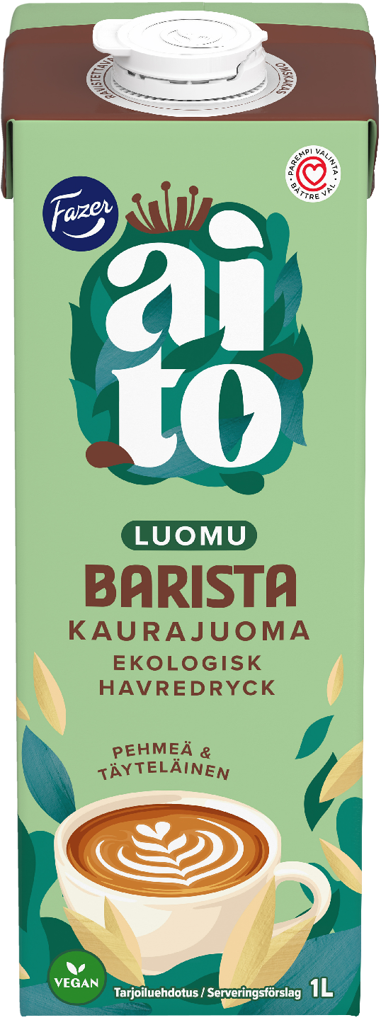 VegaaninenUusi Fazer Aito Kaurajuoma Barista Luomu tuo ihanan kahvielämyksen jokaiseen kotiin ja juhlistaa arkisintakin kahvihetkeä. Halutessasi voit vaahdottaa kaurajuoman vaahdoksi kahvin päälle. Fazer Aito Kaurajuoma Barista Luomu sopii hyvin myös leivontaan ja ruuanlaittoon, kuten sämpylätaikinan pohjaksi tai riisipuuron keittoon. Valmistettu luomu raaka-aineista. UHT-käsitelty, säilyy avaamattomana huoneenlämmössä. Vegaaninen.