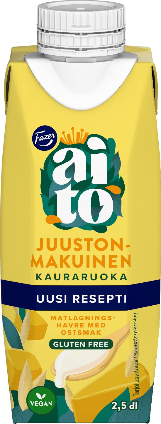VegaaninenKasvipohjainen Fazer Aito Kauraruoka Juustonmakuinen tekee ruoanlaitosta helppoa. Lisäät sillä kätevästi täyteläisyyttä ja makua kastikkeisiin ja keittoihin. Fazer Aito Kauraruoka on vegaaninen vaihtoehto kermalle. Tuote on gluteeniton sekä maidoton.