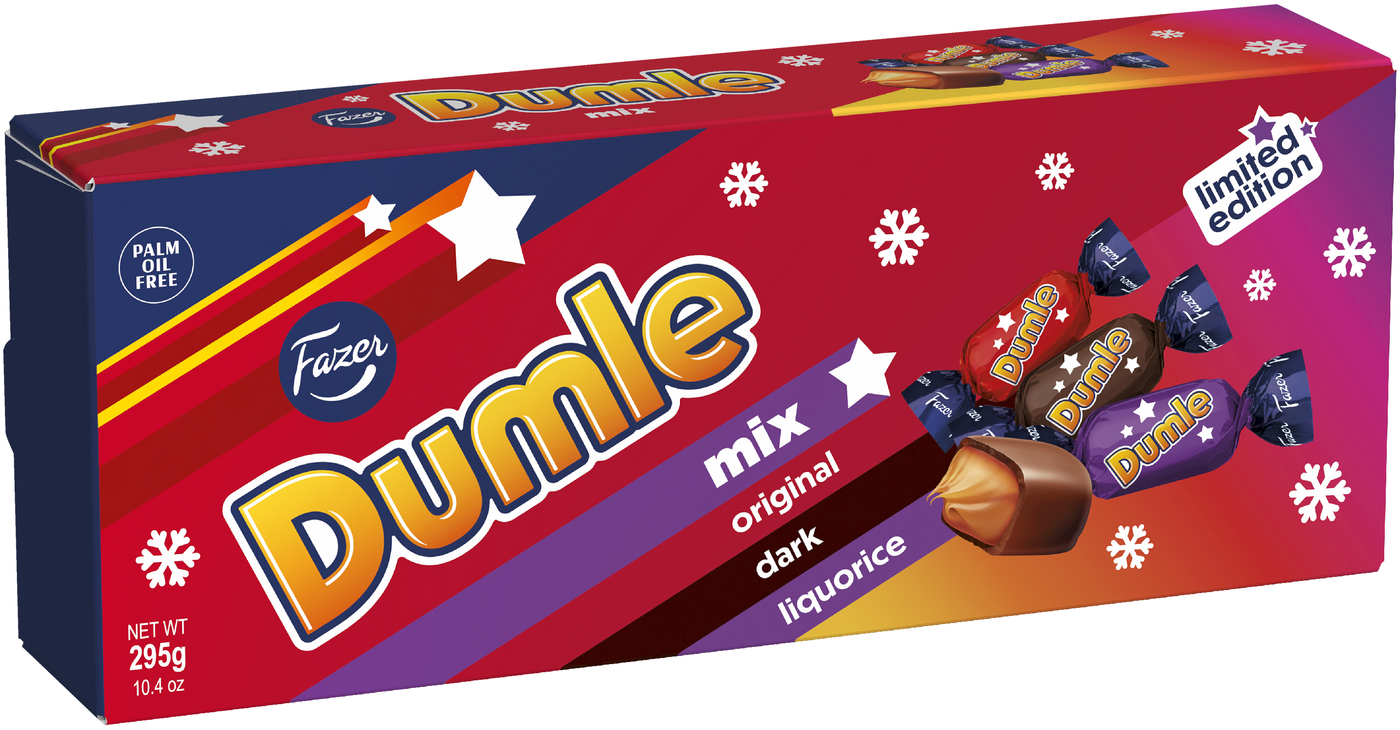 Dumle on rakastettu klassikko, joka on yhdistänyt meitä sukupolvien ajan. Sen ainutlaatuinen makuyhdistelmä pehmeää toffeekaramellia ja samettista suklaata tarjoavat vastustamattoman makuelämyksen! Yhdessä rasiassa kolme hauskaa makua – original, laku ja tummasuklaa – jotka täyttävät jokaisen maku-unelmat suussa sulavalla pehmeydellään. Anna Dumle-rasia lahjaksi tai jaa riemua kavereiden kanssa. Palmuöljytön. Noudatamme kaakaonhankinnassamme Fazerin kaakaovisiota. Lue lisää www.fazercocoavision.com. Let´s stick together!
