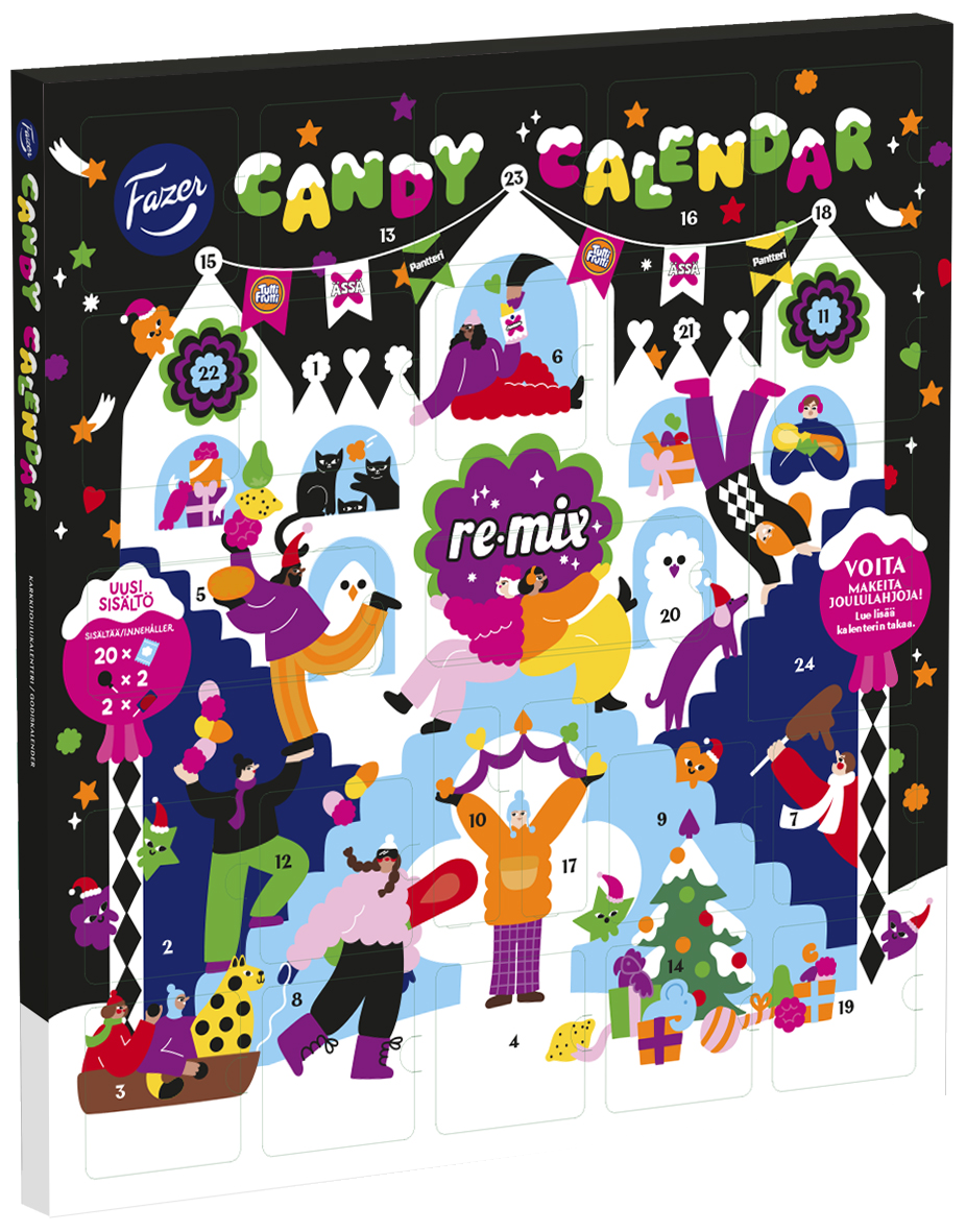 Fazerin uudistunut Karkkikalenteri tekee joulunodotuksesta makeampaa! Uusi sekoitus karkkihyllyn suosikkeja hedelmäkarkeista salmiakkiin ja suklaiseen Dumle-tikkariin yllättää ja ilahduttaa karkinystäviä jokaisena päivänä jouluaattoon asti. Karkkikalenterista löydät nyt entistä enemmän pikkuisia karkkipusseja, joiden karkit ovat tuttuja Remix-, Tutti Frutti-, Ässä- ja Pantteri-suosikkipusseista. Tänä jouluna luvassa on vielä yksi yllätys: kalenterin luukku 24 on pääsylippusi suureen jouluarvontaan, josta voit voittaa makeita joululahjoja. Suloisen makeaa joulua!