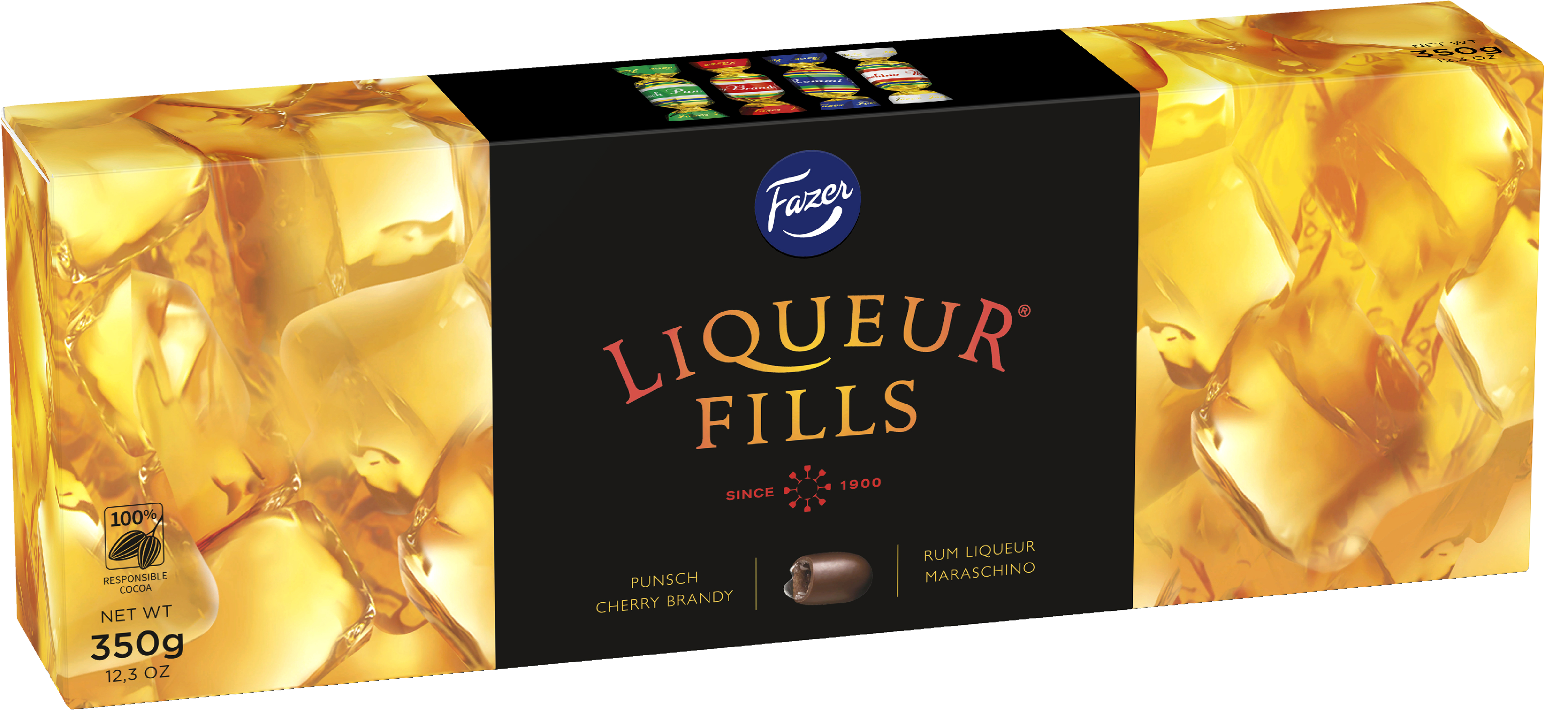 Fazer Liquer Fills -konvehdit hurmaavat ajattoman tyylikkäällä maullaan. Liköörikonvehtien tumma suklaakuori sulkee sisäänsä rommin, punssin, maraschinon ja kirsikkabrandyn maut. Noudatamme kaakaonhankinnassamme Fazerin kaakaovisiota. Lue lisää www.fazercocoavision.com. Nämä juhlapöydän klassikot sopivat yhteiseen joulun tunnelmointiin ja kauden hienostuneeksi lahjaksi.