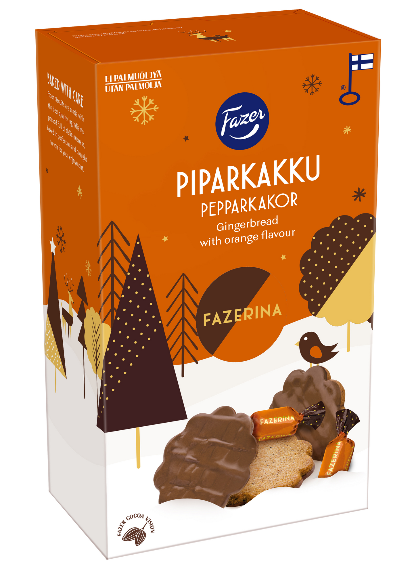 Fazerin maitosuklaanmakuisella kuorrutteella päällystetty pieni herkullinen piparkakku maistuu sopivasti joulun mausteilta ja Fazerinalta. Se on herkullinen tarjottava joulun alusajan juhlissa. Pieni piparkakku on juuri sopivan kokoinen tarjottavaksi vaikkapa glögin kanssa. Kaunis pakkaus sopii hyvin myös jouluiseksi tuliaiseksi.? Noudatamme kaakaonhankinnassamme Fazerin kaakaovisiota. Lue lisää www.fazercocoavision.com.