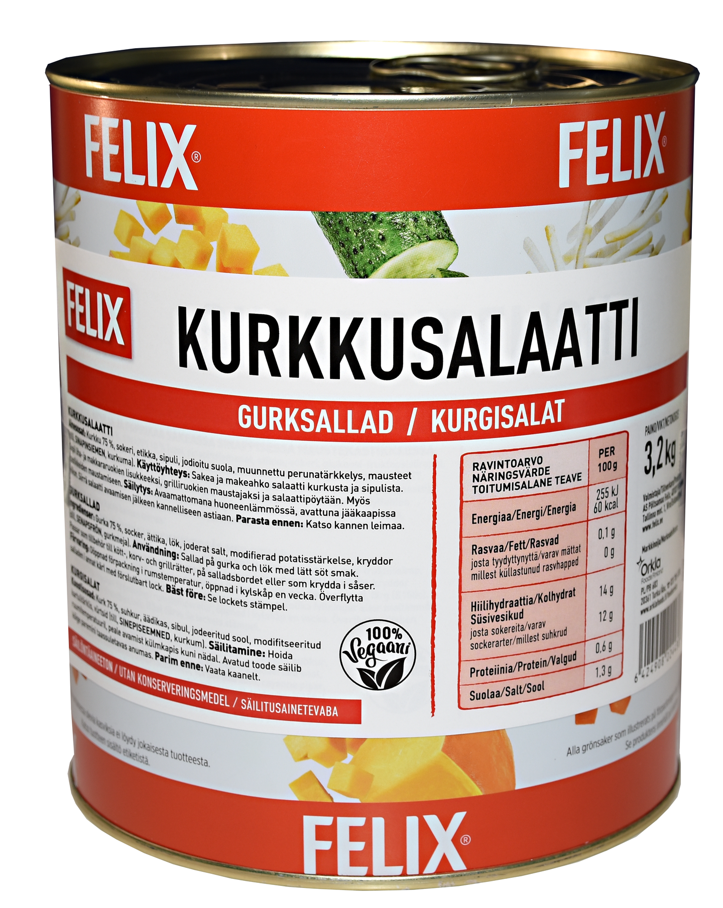 Kurkku 75 %, sokeri, sipuli, etikka, vesi, jodioitu suola, muunnettu perunatärkkelys, happamuudensäätöaine (etikkahappo), mausteet (tilli, kurkuma).