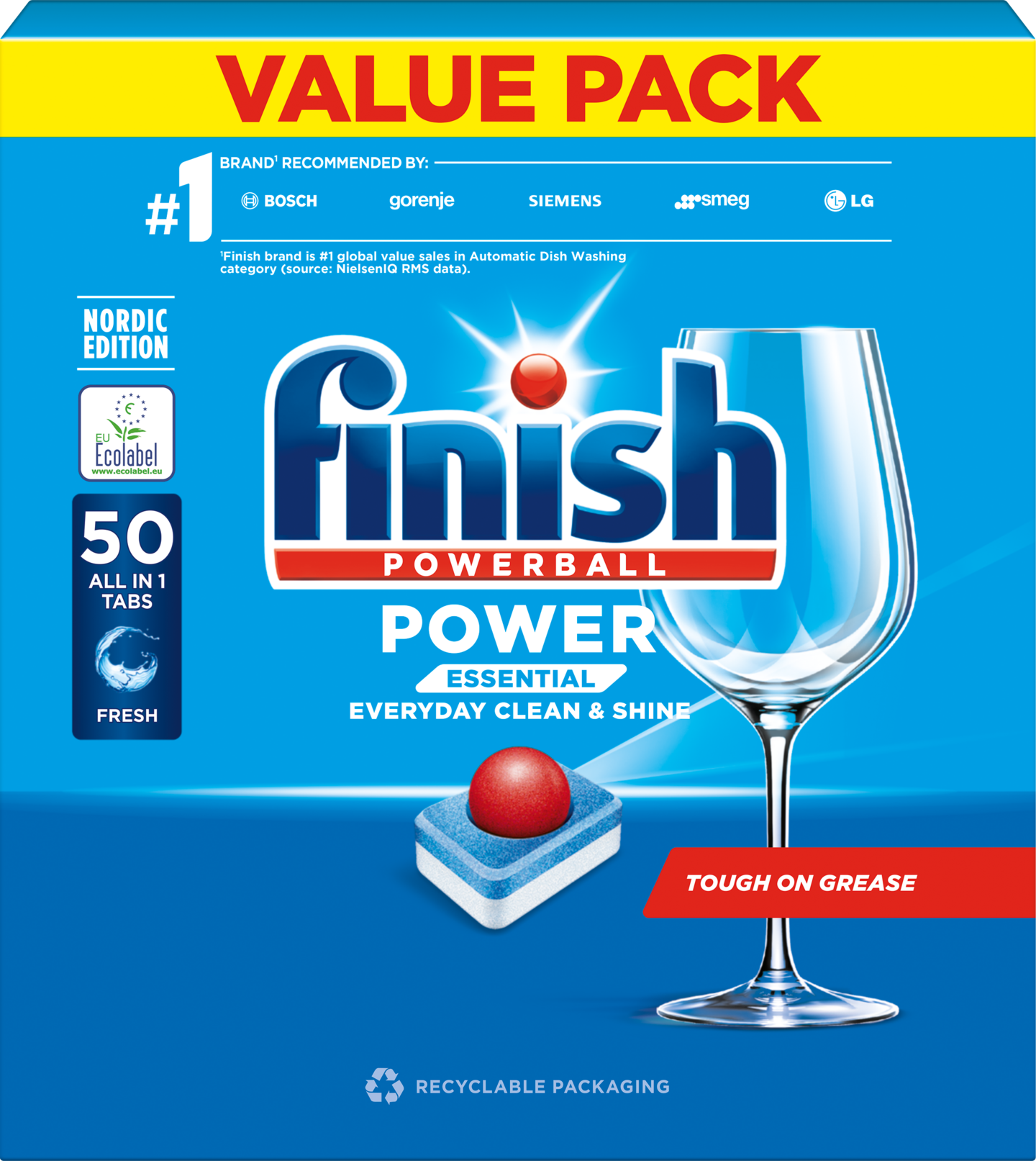 "Finish Power Essential, your All in 1 solution for your dishes. Our Powerball supercharges the tablet for everyday clean 1st time, every time.