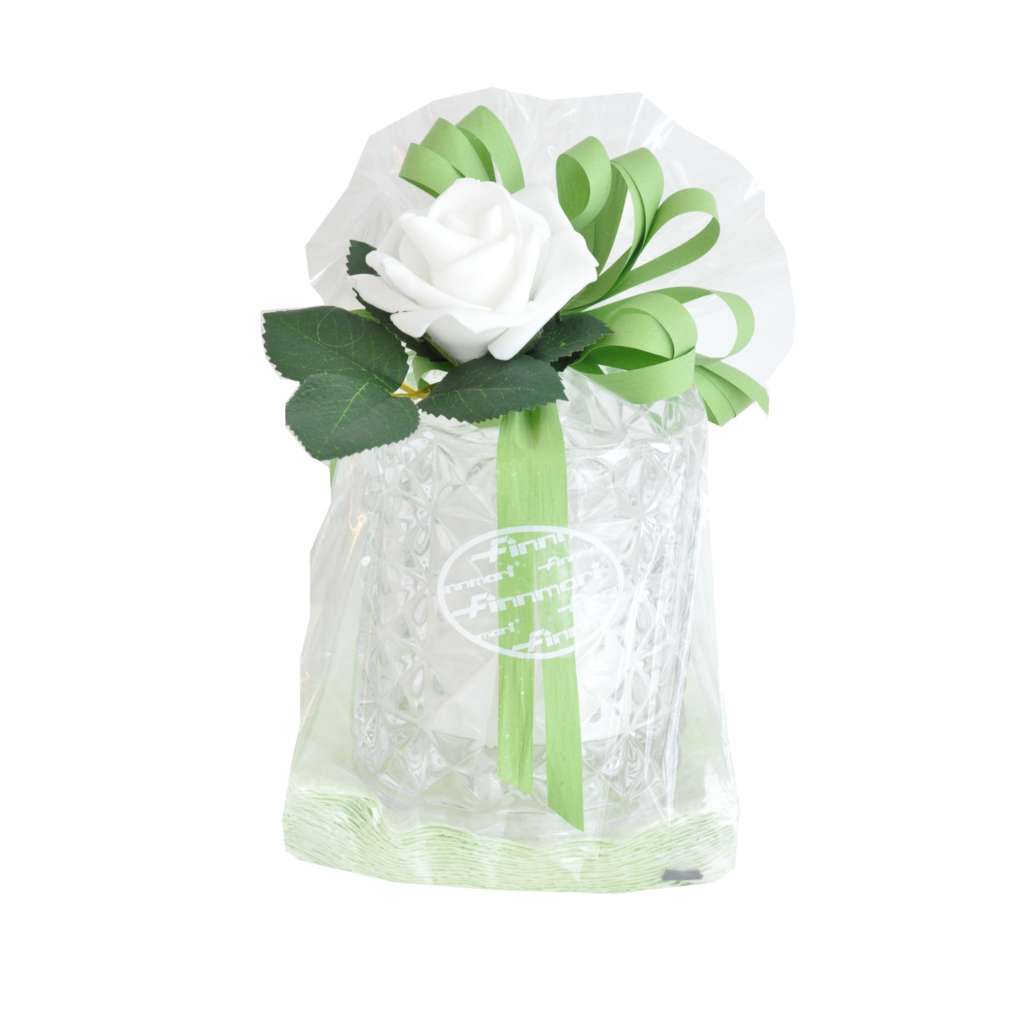 Finnmari kynttilälahjapakkaus servetit, valettu lasi, koristeruusu+lehdet vihreä