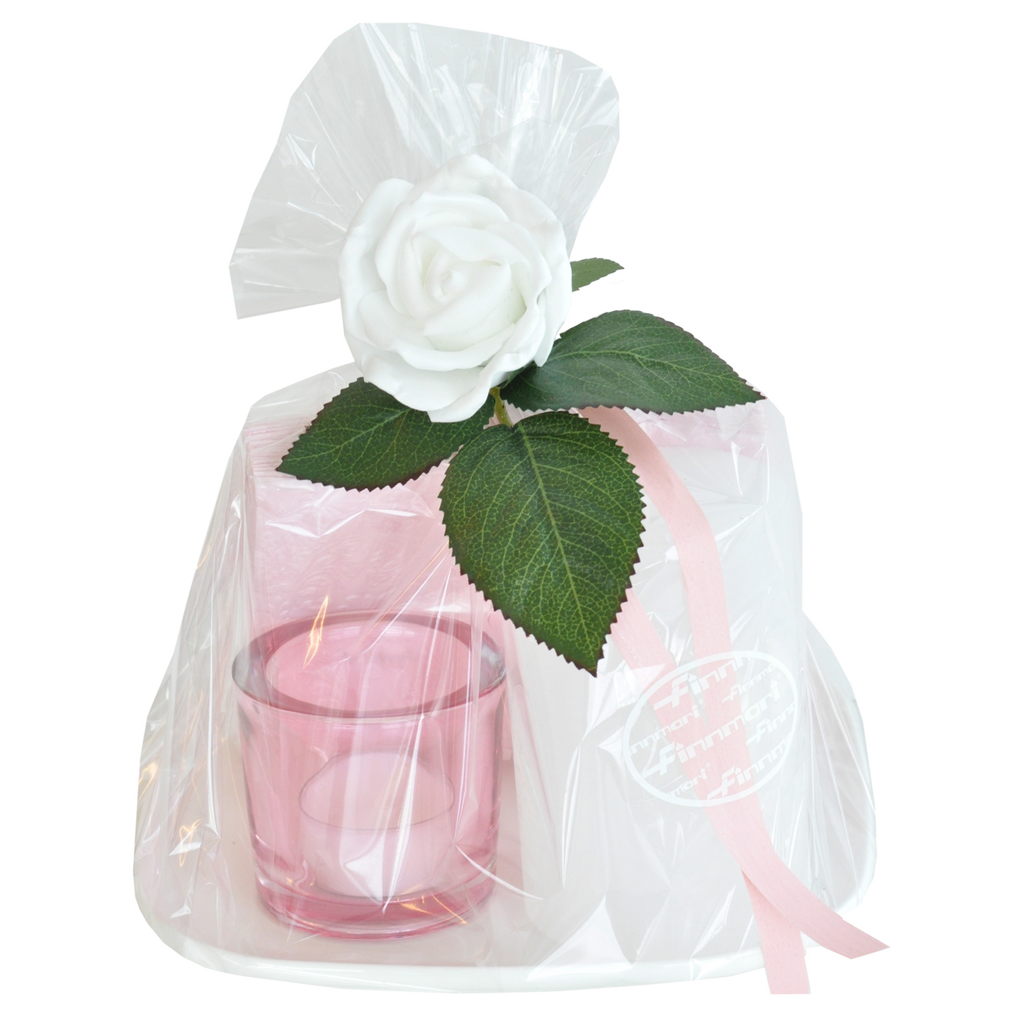 Finnmari lahjapaketti posliinialusta, vaal.pun kynttilälasi, valk kynttilä 8cm ja lautasliina