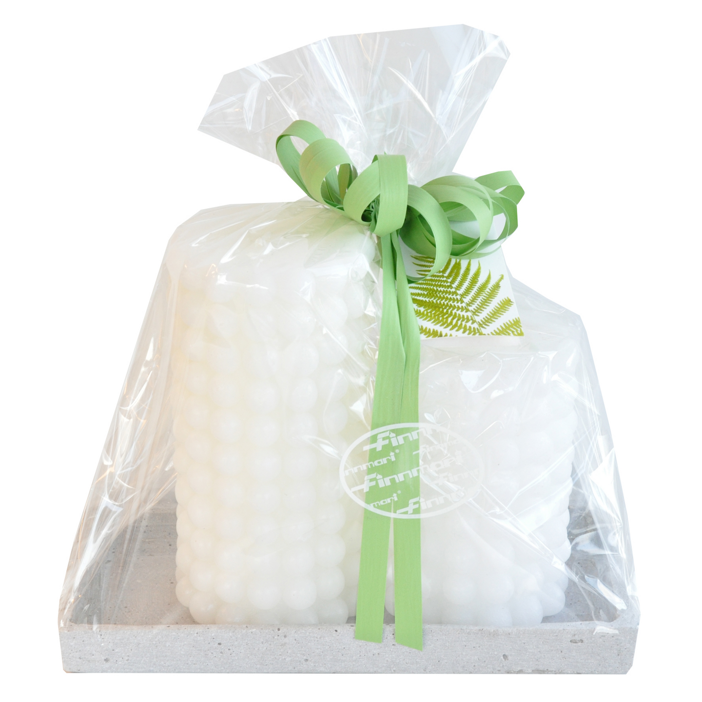 Finnmari lahjapakkaus alusta + valkeat pallokuvioidut kynttilät