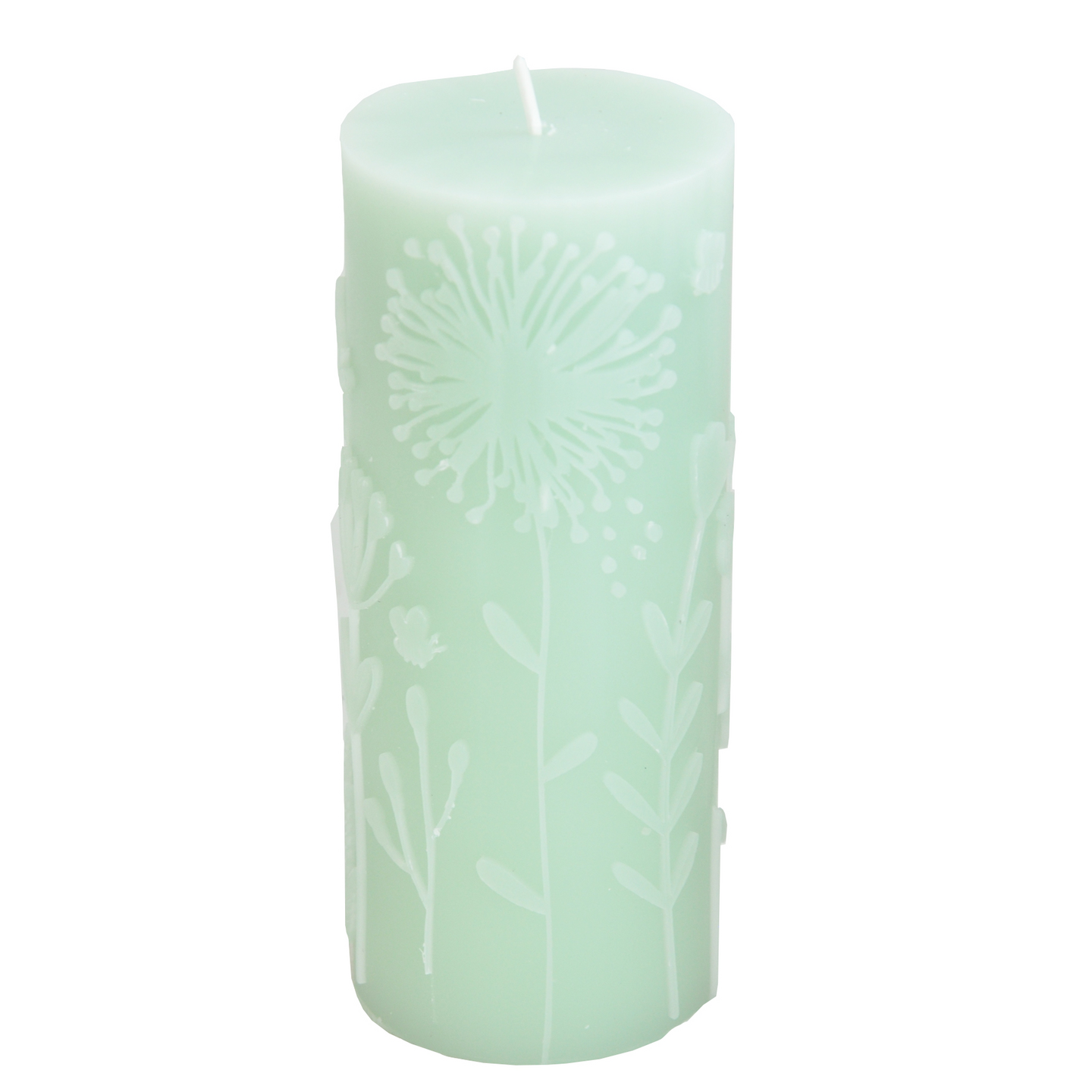 Hempeän vihreä kynttilä, jossa kukka kohokuvio.