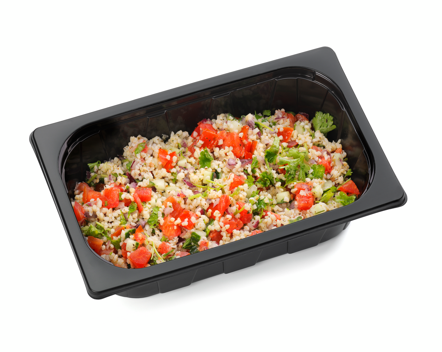 Maustettu bulgur 50 % (bulgur (vesi, DURUMVEHNÄ, rypsiöljy), mausteseos (suola, mausteet (minttu, sitruunamehu, persilja), dekstroosi, aromit)), kurkku, tomaatti, punasipuli, persilja 5 %, rypsiöljy