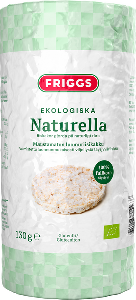 GluteenitonFriggs luomu riisikakut ovat suolattomia, luonnollisesti gluteenittomia ja runsaasti täysjyvää sisältäviä riisikakkuja. Sopii välipalaksi sellaisenaan tai suosikkitäytteilläsi päällystettyinä.