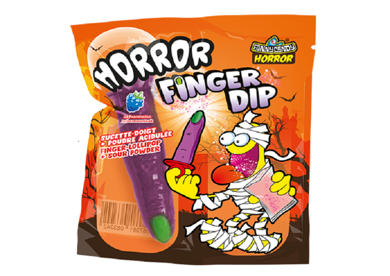 Horror Finger Dip on dipattava tikkari, jonka tikkariosassa on halloweeniin hauskasti sopiva irtosormi ja dipattavaa kirpeää makeisjauhetta. Saatavana kaksi eri makua: vadelma ja cola.