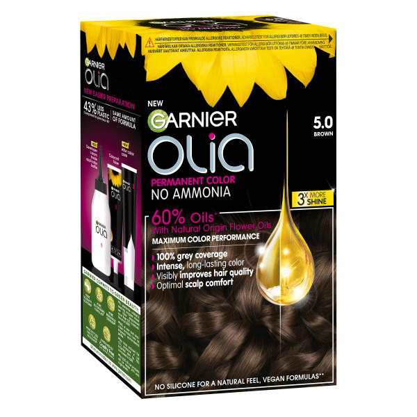 Garnier Olia 5.0 Brown, kestoväri ilman ammoniakkia, jonka koostumus sisältää 60% öljyjä*, antaa maksimaalisen värjäystuloksen ja tekee hiuslaadusta näkyvästi paremman. Olia 5.0 peittää harmaat hiukset jopa 100% ja on miellyttävä hiuspohjalle. 98% naisista ei havainnut näkyviä vaurioita** hiuksissaan. *Värivoiteessa **Kuluttajatutkimus, 262 naista, käytettäessä koko pakkaus.