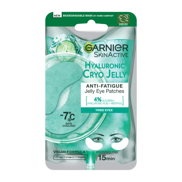 Näyttääkö silmänympärysihosi samealta? Kokeile uusia Garnier SkinActive Hyaluronic Cryo Jelly -silmänalusnaamiota, jotka taistelevat väsymyksen merkkejä vastaan. Viilentävä geelinaamio, jonka koostumus sisältää hyaluronihappoa ja kurkkua. Alentaa välittömästi ihon lämpötilaa 7 astetta ja vähentää väsymyksen merkkejä. Koostumus sisältää 4% glyserolia, mentolia ja hyaluronihappoa ja se vahvistaa ihon suojamuuria ja jättää iholle raikkaan tunteen. • Kaikille ihotyypeille. • Vegaaninen koostumus*. • Virallisesti hyväksytty Cruelty Free International Leaping Bunny -ohjelmaan. *Vegaaninen koostumus: Ei sisällä eläinperäisiä ainesosia