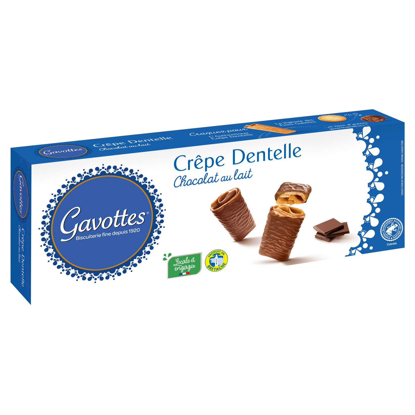 Hienostuneet, jäljittelemättömän rapeat crepe dentelle keksit valmistetaan ranskalaisen keittiön perinteen mukaisesti. Keksit ovat vaaleita ja kultaisia ja ne koostuvat erittäin hienoista ja kevyistä käärityistä kerroksista. Keksit ovat loistavia sellaisenaan, sekä kahvin, samppanjan tai viinin kanssa. Kokeile keksejä myös viimeistelemään jäätelöannos tai kermainen jälkiruoka. Keksien rapeus ja suklaa nostavat jälkiruuat aivan uudelle tasolle. Keksit leivotaan tarkasti valituista raaka-aineista. Valmistuksessa käytetään ranskalaista voita, sokeria ja jauhoja vastuullisilta toimittajilta sekä Rainforest Alliance sertifioitua kaakaota. Näitä ihastuttavia keksejä voi hyödyntää myös leivonnassa. Ne sopivat hienosti esimerkiksi tuhatlehtileivoksiin ja suolakaramelli-tiramisuun niin makunsa kuin rakenteensakin puolesta.