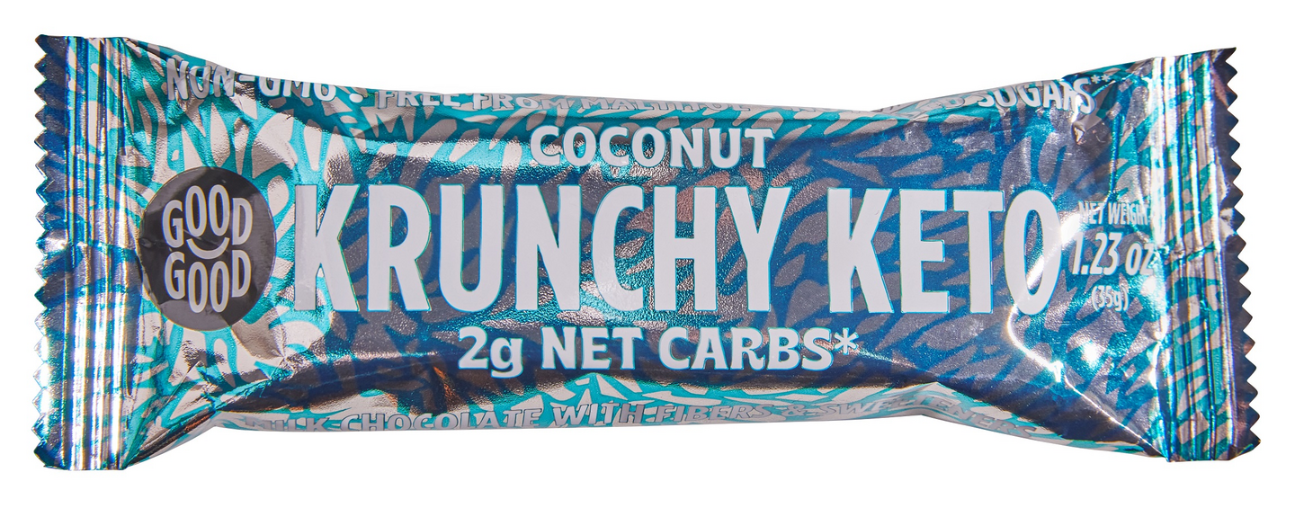 RunsaskuituinenGood Goodin herkullisen rouskuva kookoksenmakuinen maitosuklaapäällysteinen patukka, joka soveltuu myös ketodieettiä noudattavalle. Ei sisällä keinotekoisia makeutusaineita tai lisättyä sokeria.